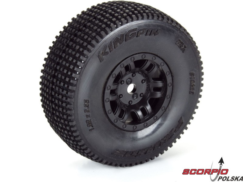 Opony zostały zaprojektowane z myślą o twardej, lekko pylistej nawierzchni wyścigowej i zapewniają stałą przyczepność, lepszą sterowność oraz właściwości jezdne inspirowane zastosowaniami wyścigowymi. Rzeźba bieżnika King Pin czerpie inspirację z legendarnych opon Hole Shot firmy Pro-Line. Dzięki temu, że są one fabrycznie zamontowane, instalacja przebiega szybko i bezproblemowo. Zestaw King Pin to pierwszy wybór opon naprawdę nastawiony na tor dla kierowców MOJAVE GROM, którzy chcą wydobyć z swojego modelu maksymalną wydajność na torze wyścigowym.