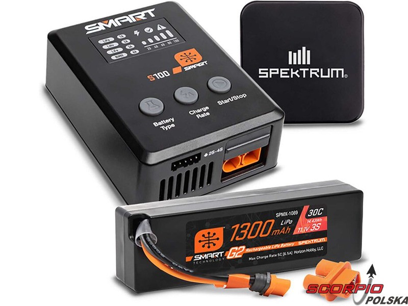 W zestawie znajduje się ładowarka Spektrum S100 1x100W USB-C, kabel USB-C 60W, adapter USB-C, akumulator Spektrum Smart G2 LiPo 11,1 V 1300 mAh 30C IC2, przejściówka IC2/IC3, instrukcja obsługi produktu.