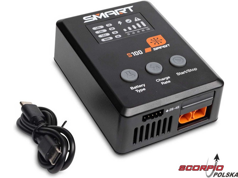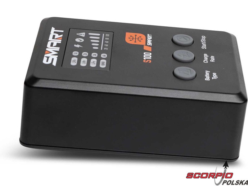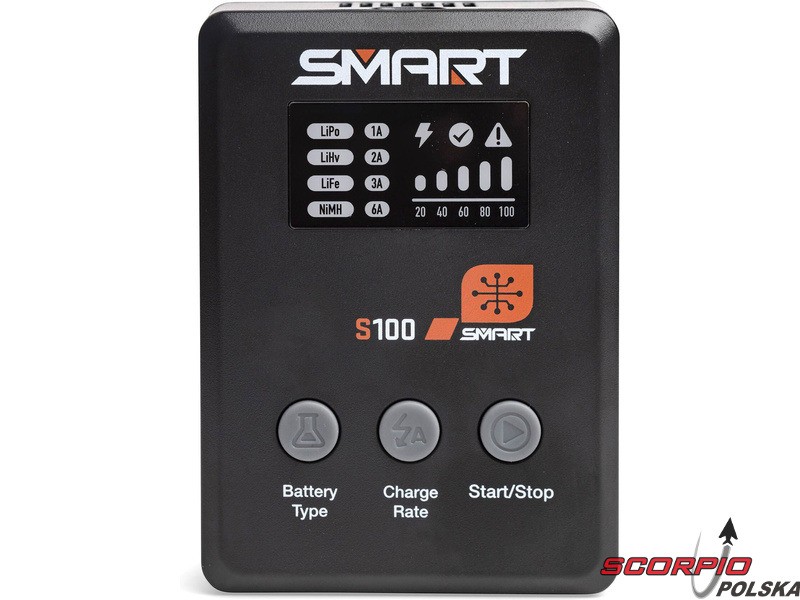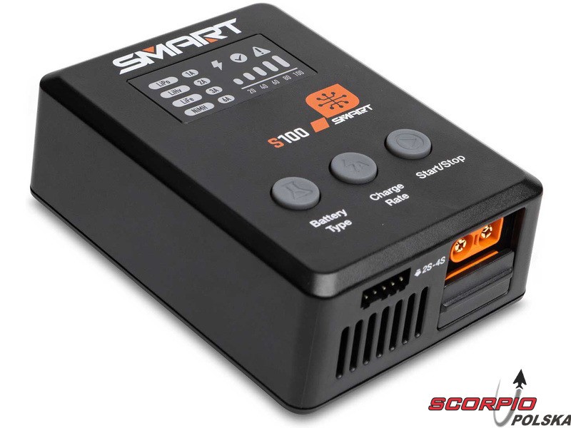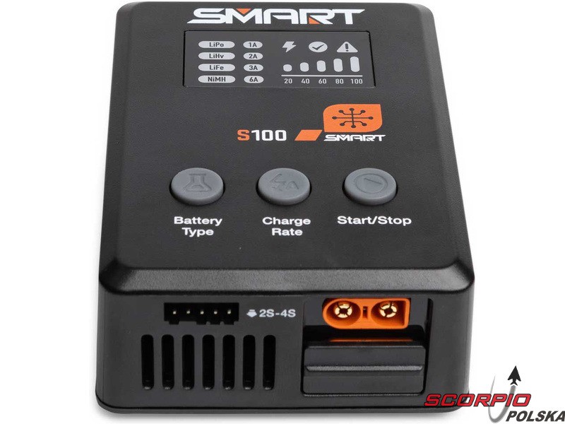 Ładowarka S100 jest zasilana przez dołączony zawart w zestawie zasilacz Spektrum™ 65W i stanowi praktyczne rozwiązanie do ładowania dla początkujących. Wszystko, czego potrzeba, jest w zestawie. Akumulatory Smart G2 mają kabel do transmisji danych z jednym prostym połączeniem IC3® lub IC5® - nie ma więc potrzeby stosowania osobnego kabla balansującego. Może być używany do ładowania wielu standardowych akumulatorów używanych w hobby 1S-4S LiPo, LiHV, LiFe.