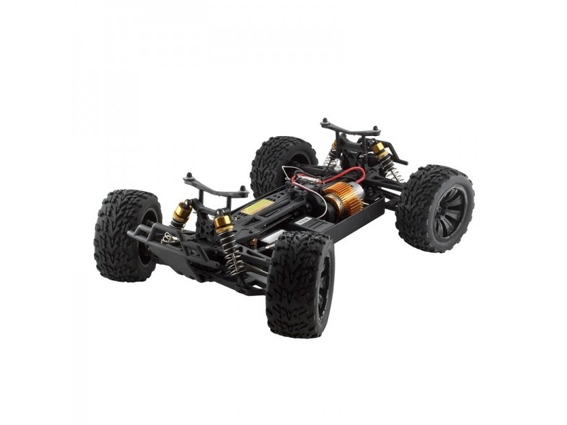 Monster Truck charakteryzuje się bardzo dobrze przemyślaną konstrukcją, wysoką jakością zastosowanych materiałów i bardzo sprawnym układem jezdnym. Napęd z mocnego silnika szczotkowego klasy 550 przenoszony jest wałem napędowym i systemem dwóch mocnych dyferencjałów na wszystkie cztery koła, co w połączeniu z wzmacnianymi amortyzatorami sprawia że model doskonale trzyma się drogi nawet przy długich, szybkich zakrętach. Właściwości jezdne wspomagane są również przez bardzo nisko i centralnie osadzony punkt ciężkości samochodu, korzystnie wpływający na stabilność modelu przy szybkich zmianach kierunku jazdy i wyskokach na hopkach. Za efektywny skręt kół przednich odpowiada fabrycznie zamontowany mocny serwomechanizm z regulowanymi, grubymi metalowymi popychaczami.Dla jeżdzących po mniej wyboistej nawierzchni, projektanci przewidzieli również możliwość delikatnego obniżenia zawieszenia, co korzystniej wpłynie tak na stabilność jak i prędkość końcową modelu. Na uwagę zasługują też odpowiednio bieżnikowane, miękkie opony o bardzo dobrej przyczepności z efektownymi felgami. Silnik zasilany jest dołączonym do zestawu markowym pakietem Redox NiMH o pojemności 1500 mAh który wystarcza nawet na kilkanaście minut zabawy. Intuicyjny, prosty w obsłudze, ergonomiczny 3-kanałowy nadajnik pistoletowy wyposażony w trymery, rewersy i regulację zakresu skrętu kół nie sprawi żadnych problemów nawet początkującym modelarzom, a technologia transmisji sygnału w paśmie 2,4GHz zagwarantuje brak zakłóceń.Do modelu dostępne są również wszystkie części zamienne. Zdecydowanie polecamy !