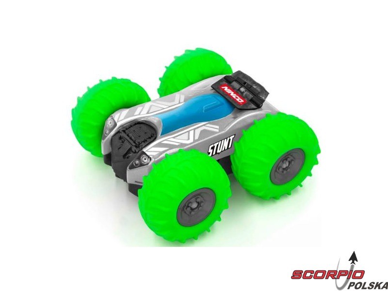 Świetny dwustronny samochodzik Nincoracers Stunt Green z dużymi oponami. Żadna przeszkoda nie jest dla niego problemem. Potrafi robić niesamowite sztuczki. Skoki, zakręty, jazda na tylnych kołach. Posiada nadajnik drążkowy 27MHz z dużym zasięgiem i wskaźnikiem zasilania LED. Zasilany jest bateriami AA.