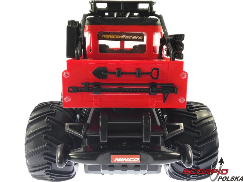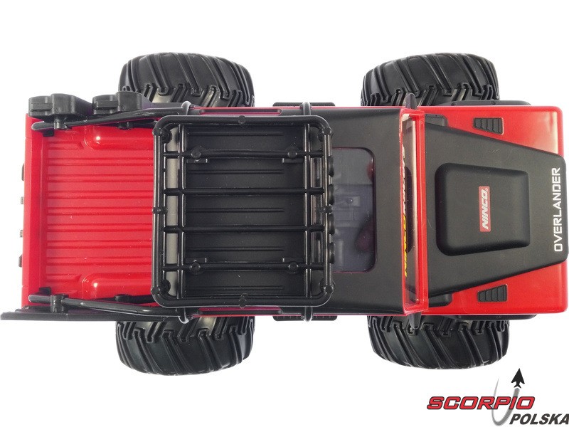 W samochodziku możemy cieszyć się doskonałym wykonaniem karoserii w kolorze czerwonym z przednią maską i funkcjonalnymi światłami, czarną maską silnika z napisem Overlander, autentycznymi obramowaniami błotników, klamkami drzwi i zawiasami. Wysoką jakość podkreśla również wykończenie wnętrza samochodu i przezroczyste szyby, które są wyjątkiem w tej kategorii zabawek.