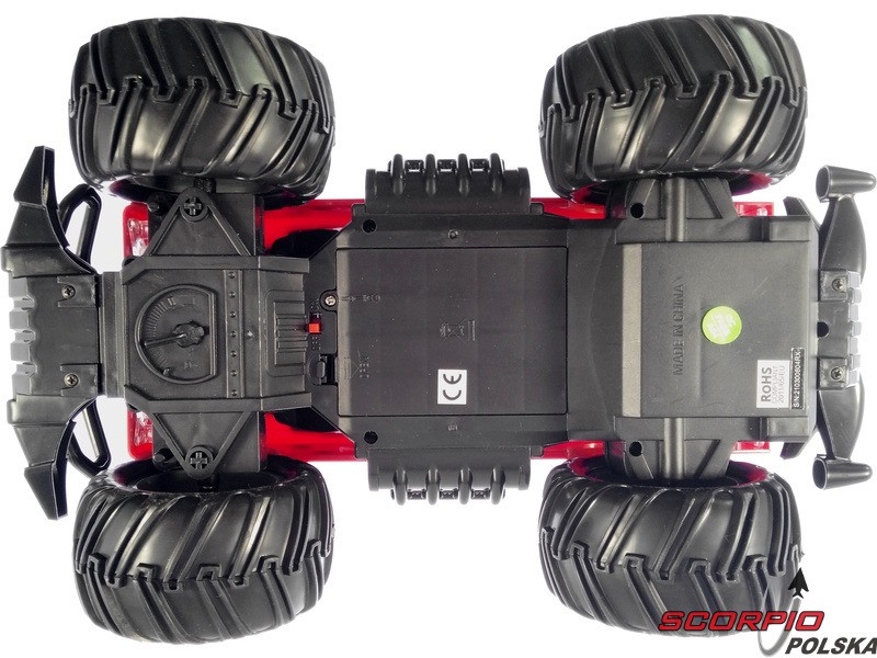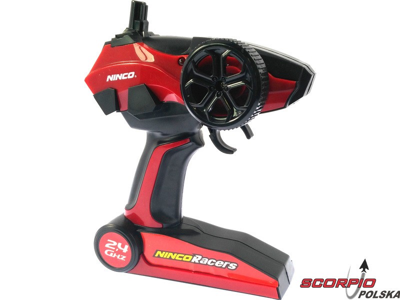 Bardzo dobrze zaprojektowany ergonomiczny nadajnik z kierownicą o dużym zasięgu. Działa na częstotliwości 2,4 GHz. Dzięki temu nie występują żadne zakłócenia. Posiada zintegrowaną antenę, która nigdy się nie złamie. Czarno-czerwona kolorystyka i duża kierownica. Nadajnik posiada następujące funkcje: jazda do przodu, do tyłu oraz skręcanie w lewo i w prawo. Położenie neutralne kół można delikatnie regulować za pomocą trymera w dolnej części samochodu.