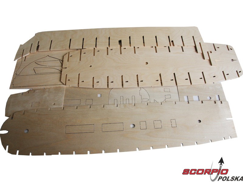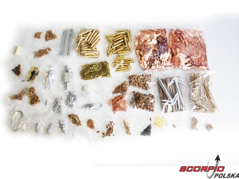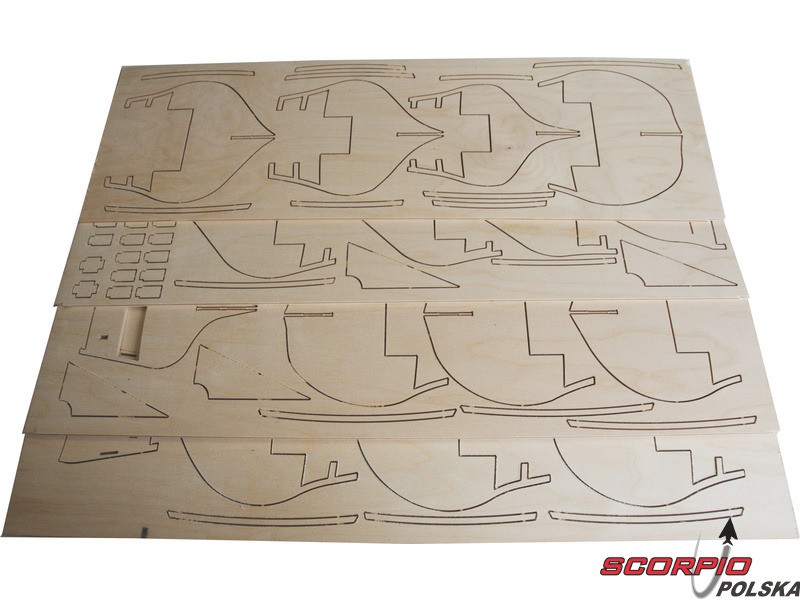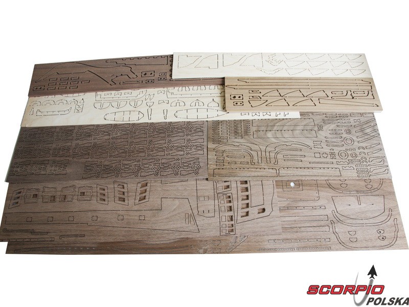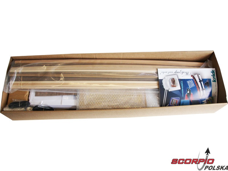 Po otwarciu pokrywy pudełka znajdziesz drewniane elementy modelu wykonane ze sklejki, zestaw listew, drobne części w woreczkach, zestaw rysunków i instrukcję.