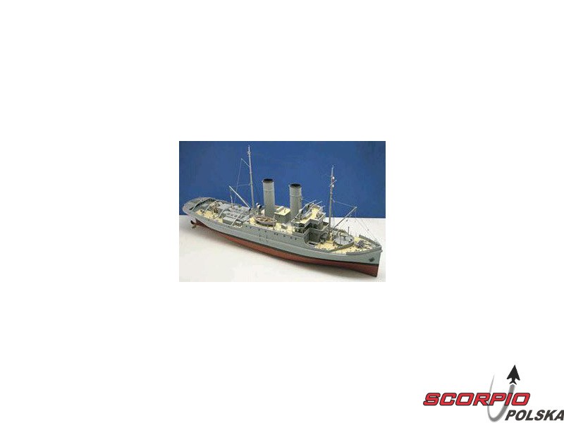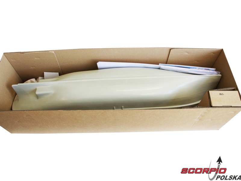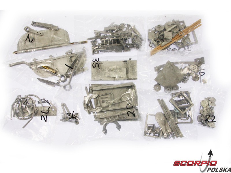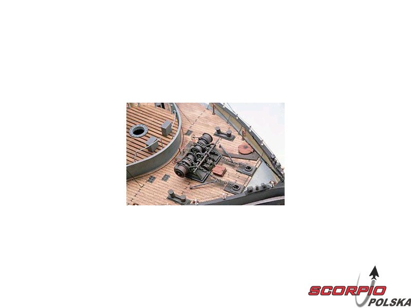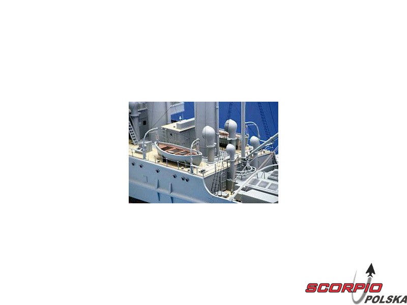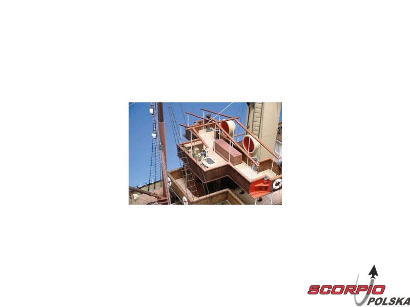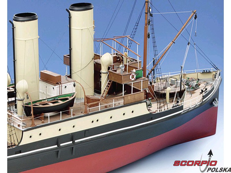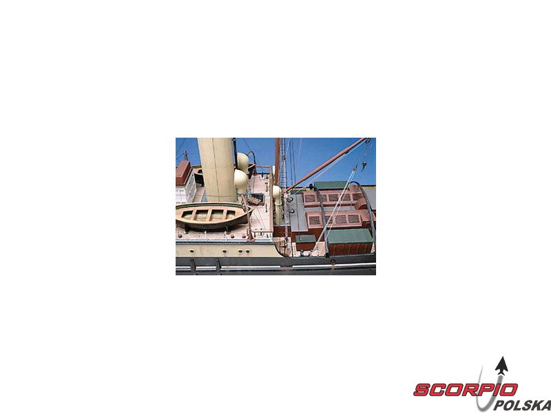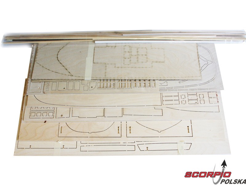 Po otwarciu pokrywy pudełka znajdziemy laminowany kadłub z kominami, drewniane elementy modelu ze sklejki, zestaw listew, drobne części i odlewy metalowe w woreczkach, zestaw rysunków i instrukcję.
