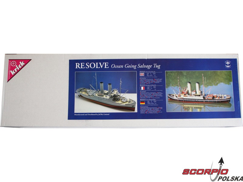 Zawartość opakowania: zestaw do budowy statku CALDERCRAFT Resolve oceaniczny holownik w skali 1:48. Opakowanie zawiera laminowany kadłub i kominy, zestaw elementów ze sklejki, zestaw drewnianych listew o różnych przekrojach, woreczki z metalowymi odlewami, elementy z mosiądzu, zestaw rysunków i wielojęzyczną instrukcję.