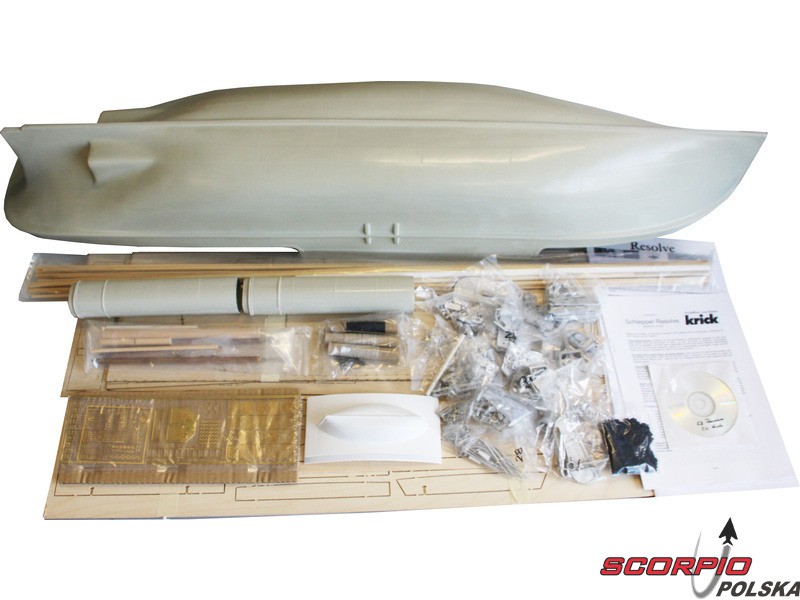 Na podstawie planów i wielu zdjęć model Resolve został odtworzony tak wiernie, jak to tylko możliwe. Jeśli chodzi o dobór materiałów, w zestawie znajdują się wysokiej jakości elementy do budowy. Kadłub jest bardzo szczegółowy i ozdobiony wszystkimi nitami i detalami makiety. Zestaw montażowy zawiera wiele odlewanych elementów metalowych i jest w pełni wyposażony w urządzenie sterowe i maszt. Szczegółowy plan z niemieckimi instrukcjami oraz wieloma szczegółowymi szkicami i ilustracjami uzupełnia ten wspaniały zestaw.