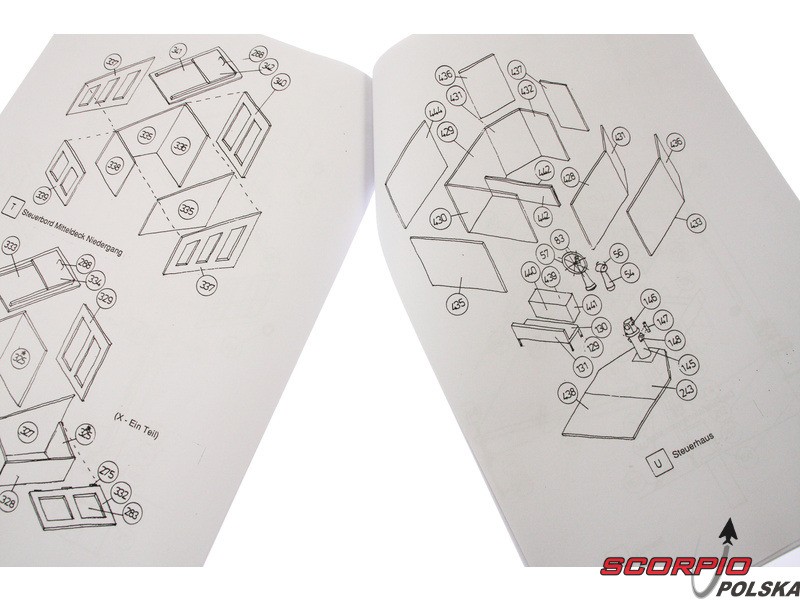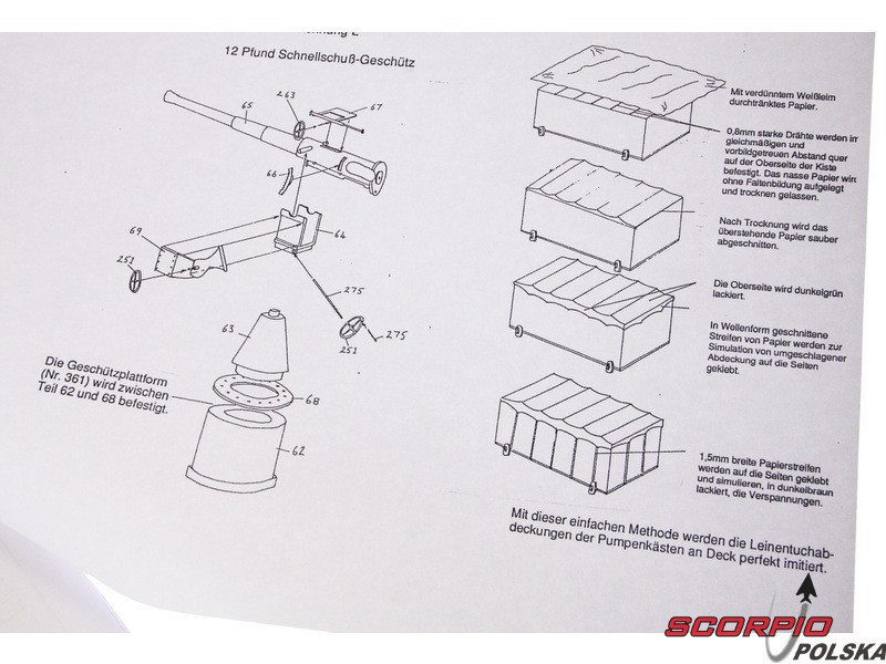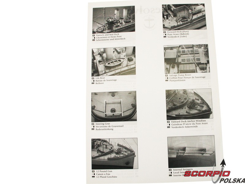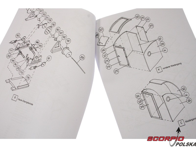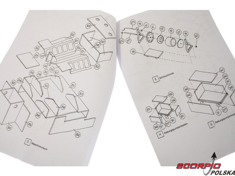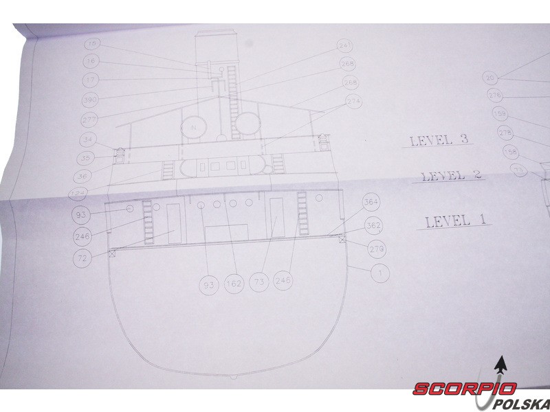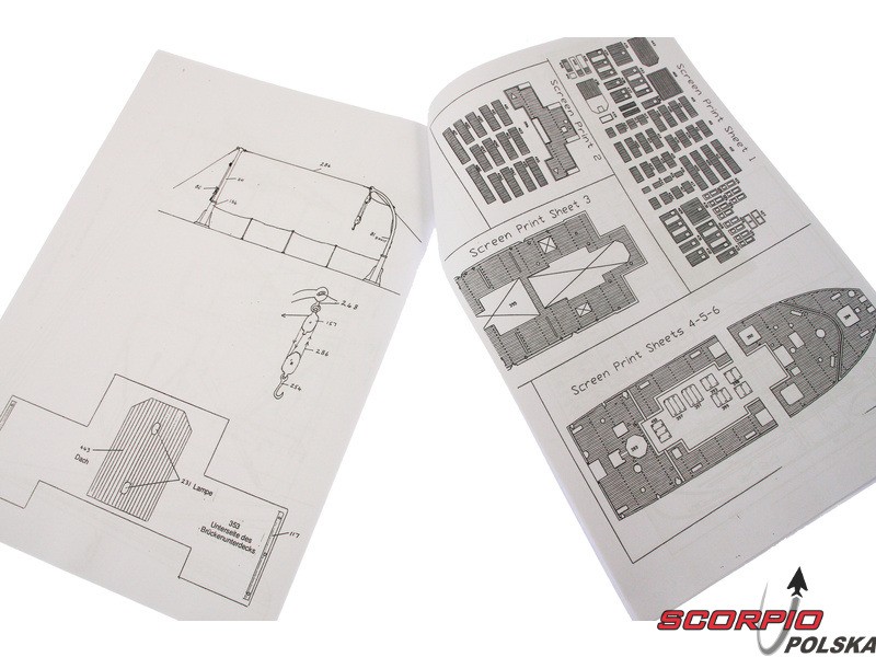 Zestaw zawiera kompletną dokumentację rysunkową modelu w skali 1:1 wraz z ilustracjami poszczególnych detali. Na rysunku przedstawiono w skali zespoły montażowe i ich kompletację. Wielojęzyczna instrukcja montażu zawiera ogólne wytyczne dotyczące logicznego składania poszczególnych elementów.
