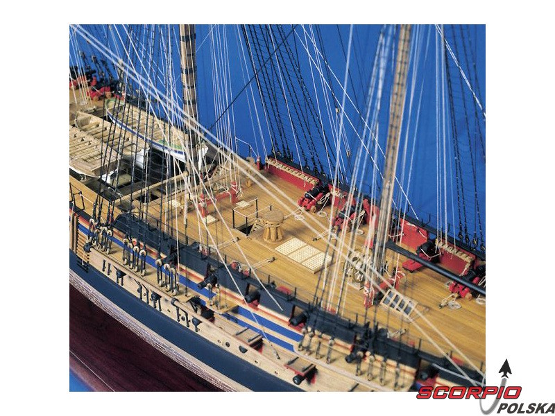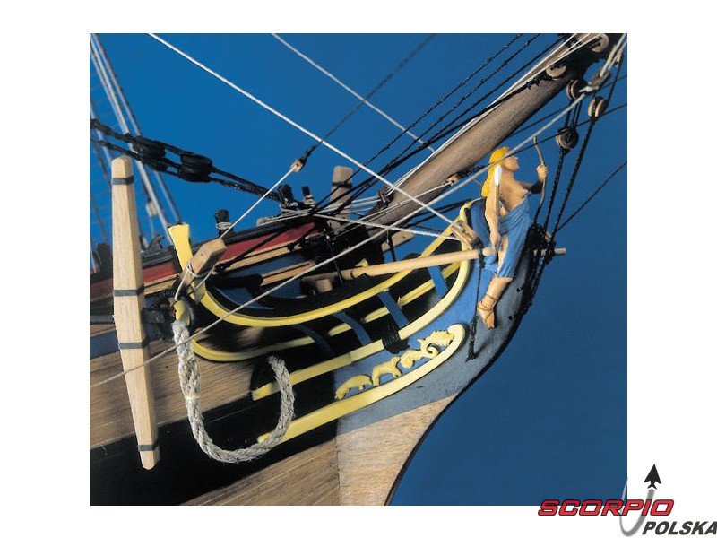 Szczegółowe plany i dokładna instrukcja montażu z wieloma wskazówkami i poradami poprowadzą użytkownika przez proces budowy tego imponującego modelu. Przeznaczony jest wyłącznie dla doświadczonych modelarzy. Kil i żebra są frezowane ze sklejki, orzech i tanganyka są wykorzystywane głównie do widocznych części, a także do uchwytów i wielu innych elementów dekoracyjnych. Takie wykorzystanie materiałów stanowi absolutną nowość na rynku. Działa 18-calowe i 9-calowe są precyzyjnie toczone z mosiądzu i mają różne średnice kół. To tylko kilka przykładów, które mają pokazać poziom wykonania tego modelu. Listwy i okrągłe drewno są wykonane z drewna lipowego, orzechowego i tangany. Dostępna jest wystarczająca ilość bloków lin i sznurów, a także 2700 miedzianych płyt do części kadłuba poniżej linii zanurzenia. Zestaw zawiera sześć szczegółowych planów budowy, 50-stronicową broszurę ze szczegółowymi ilustracjami i dokładnymi instrukcjami budowy w języku niemieckim, zawierającą wiele wskazówek i informacji, które pomogą zbudować ten imponujący model, zalecany tylko dla doświadczonych modelarzy.