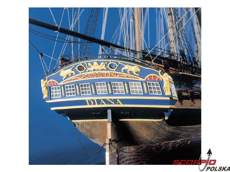 Wysokiej jakości zestaw do budowy modelu historycznego statku CALDERCRAFT H.M.S. Diana fregata 1794 w skali 1:64 to typowa brytyjska fregata z czasów admirała Nelsona. Kil i żebra są precyzyjnie obrabiane frezarką CNC z sklejki, a elementy dekoracyjne z drewna lipowego i tangany. Zawiera wiele detali, elementów metalowych, szczegółowe plany budowy i niemiecką instrukcję.