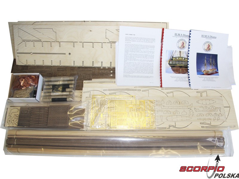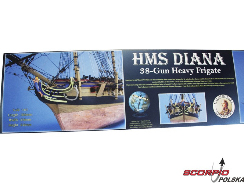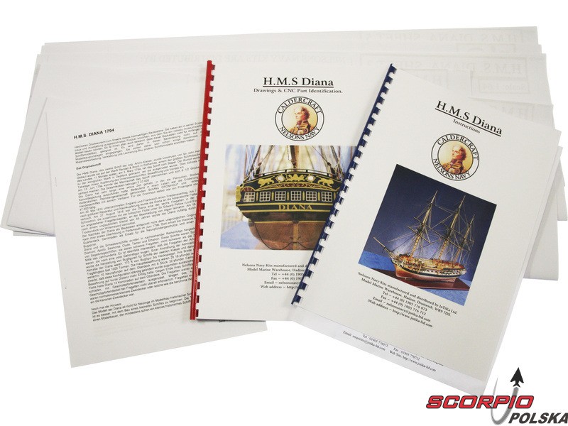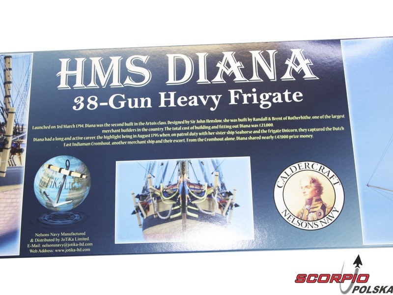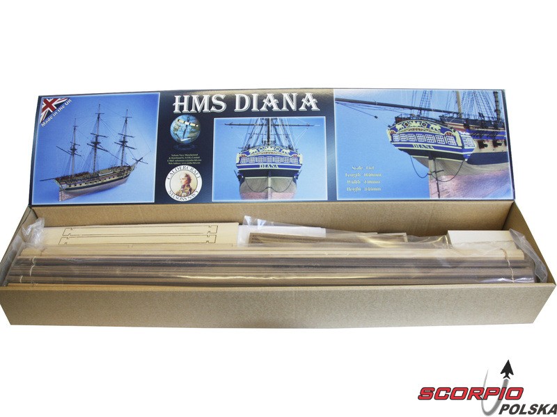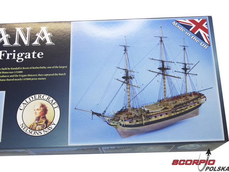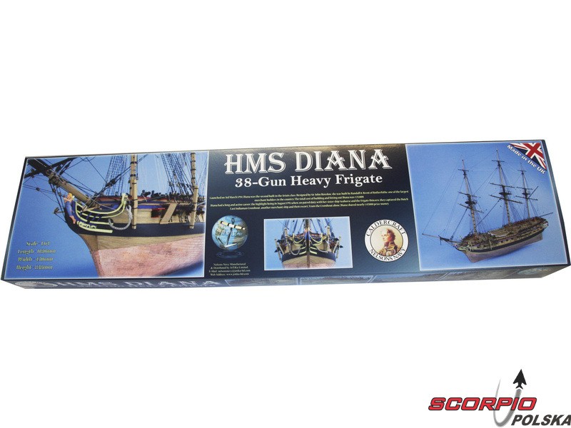 Wysokiej jakości zestaw do budowy modelu historycznego statku CALDERCRAFT H.M.S. Diana fregata 1794 w skali 1:64 to typowa brytyjska fregata z czasów admirała Nelsona. Kil i żebra są precyzyjnie obrabiane na CNC z sklejki, a elementy dekoracyjne z drewna lipowego i tangany. Zawiera wiele detali, elementów metalowych, szczegółowe plany budowy i niemiecką instrukcję.