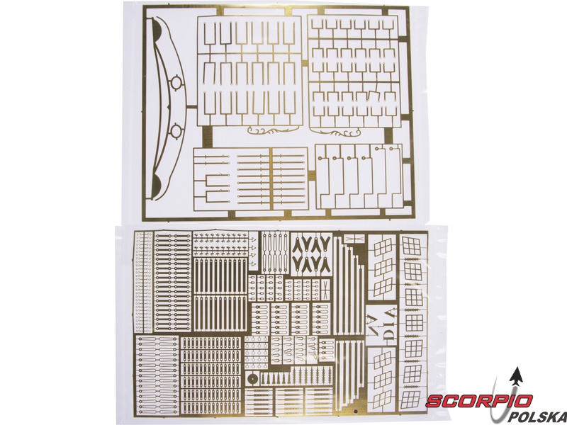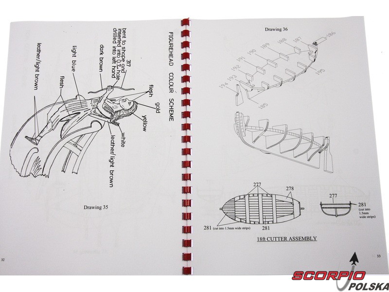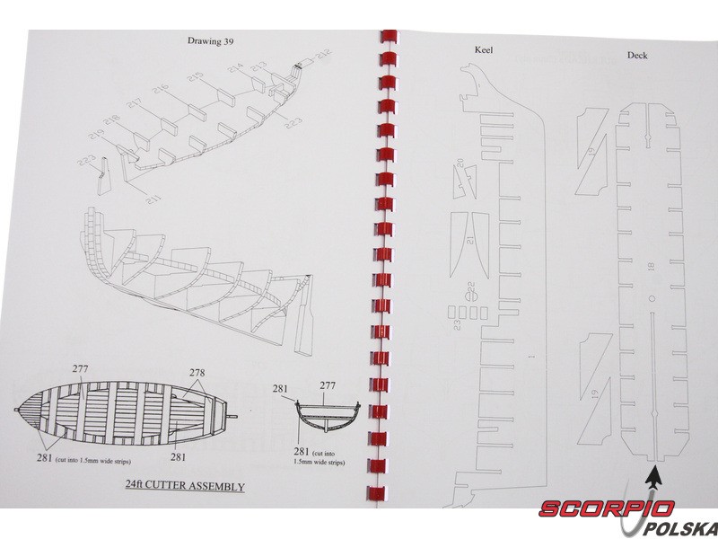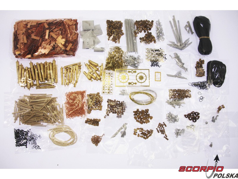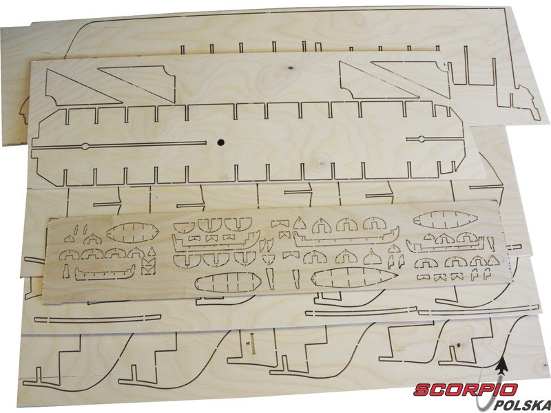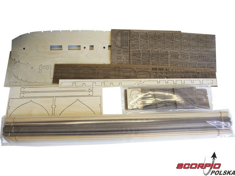 Po otwarciu pokrywy pudełka znajdziemy laminowany kadłub, drewniane elementy modelu wykonane ze sklejki, zestaw listew, drobne części zamknięte w woreczkach, zestaw rysunków i instrukcję.