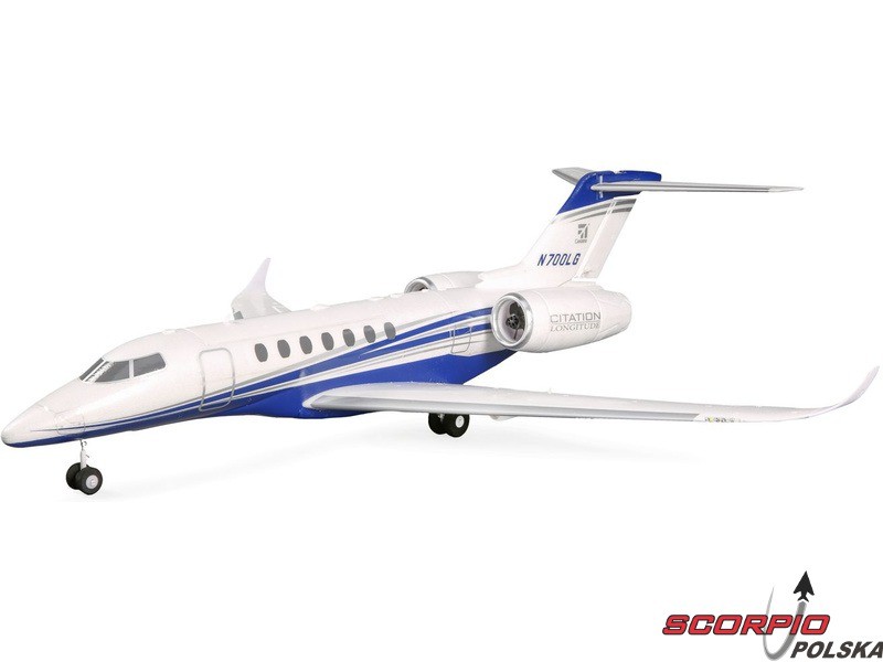 Model RC E-flite® UMX ™ (Ultra Micro eXtreme) Citation Longitude umożliwia wszystkim miłośnikom i fanom samolotów biznesowych zaznać radości z pilotażu za pośrednictwem modelu RC i to w łatwo dostępnej formie. Dla posiadaczy nadajnika Spektrum, z którym się paruje model potrzeba jeszcze tylko taniego akumulatora 3-ogniw LiPol 800mAh. Po otwarciu kartonu jest do dyspozycji kompletnie gotowy i pomalowany model, który po krótkim przygotowaniu nadajnika i sparowaniu jest gotowy do lotu. Model jest wyposażony w elektroniczną stabilizację lotu AS3X, która stała się już standardowym wyposażeniem mikro modeli E-flite. Dodatkowo dla modelarzy, którzy nie są całkowicie pewni czy opanują model, producent przychodzi z pomocą opcjonalnej ochrony położenia w locie SAFE. Ten system potrafi ograniczyć nachylenie modelu i uchronić przed przejściem modelu na plecy lub w spiralę. Wystarczy tylko zwolnić drążki nadajnika do neutrum, a model sam wyrówna do lotu poziomego. Tą funkcję można przypisać do przełącznika, którym można funkcję SAFE aktywować i dezaktywować.