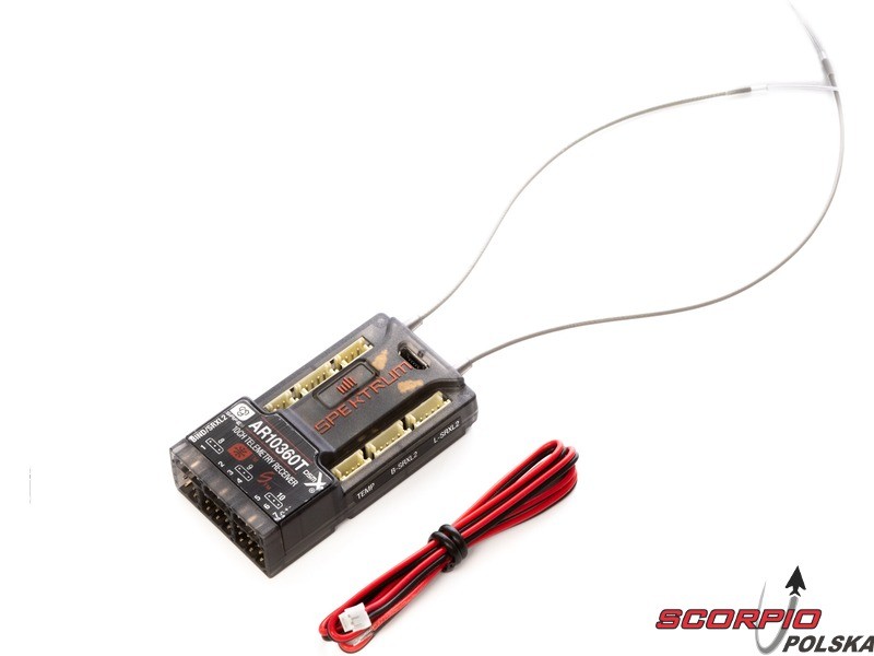 Lotniczy 10-kanałowy odbiornik Spektrum AR10360T DSM2/DSMX z telemetrią z pełnym zasięgiem i stabilizacją AS3X, która za pomocą 3-osiowego żyroskopu MEMS tłumi wpływ wiatru, turbulencji. Odbiornik ma zintegrowany czujnik barometryczny, który mierzy wysokość i vario. Przycisk parowania, konektor mikro USB.