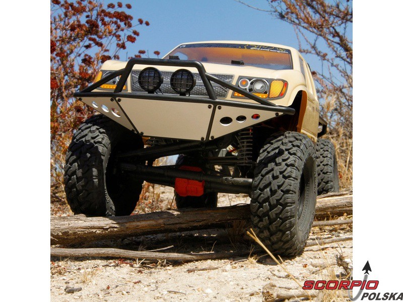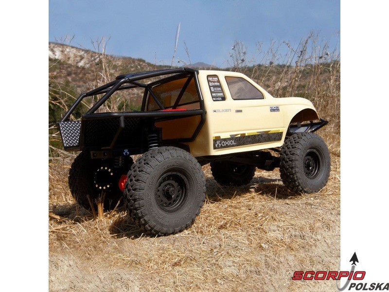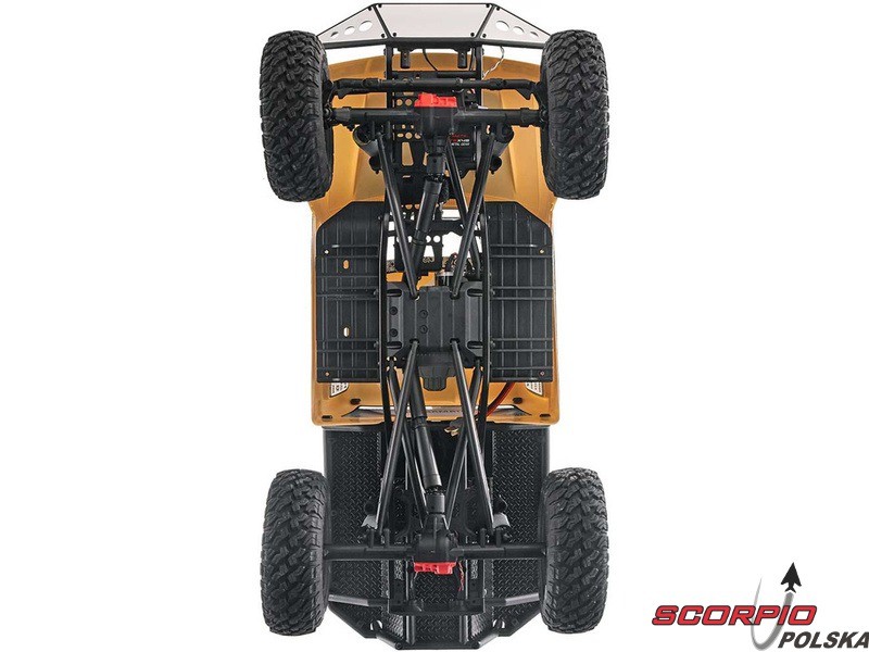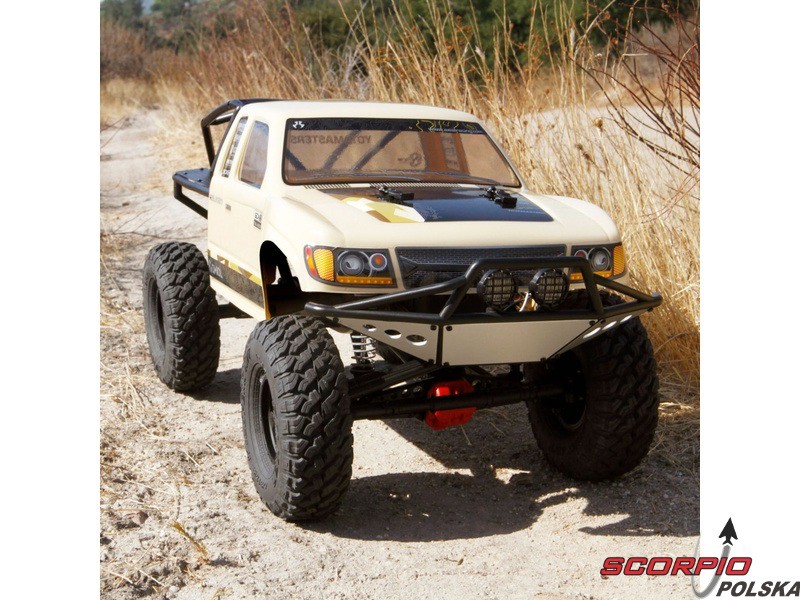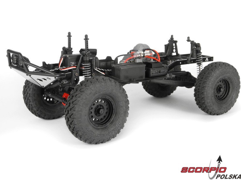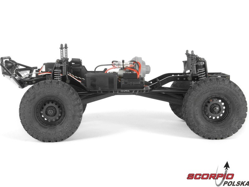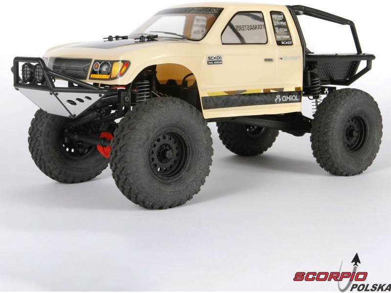 RC model popularnego auta ekspedycyjnego Axial SCX10 II Trail Honchow skali 1:10 jest kompletnie złożony i przygotowany do jazdy. Między stalowe profile ramy zainstalowane jest podwozie z przekładnią, mocowanie zawieszenia, zderzaki i wyposażenie elektro. Gotowa karoseria, aparatura RC. Model jedzie z szybkością aż 5 km/h. Przybliżony czas jazdy z LiPol 2s 5000mAh wynosi 45-60 minut.