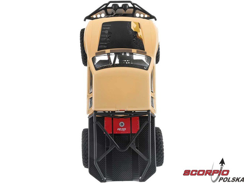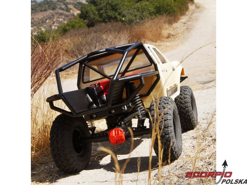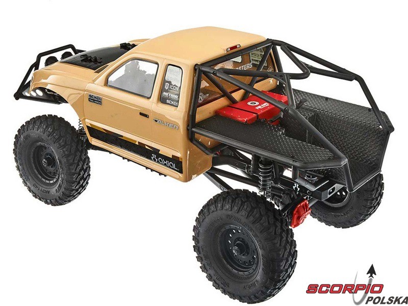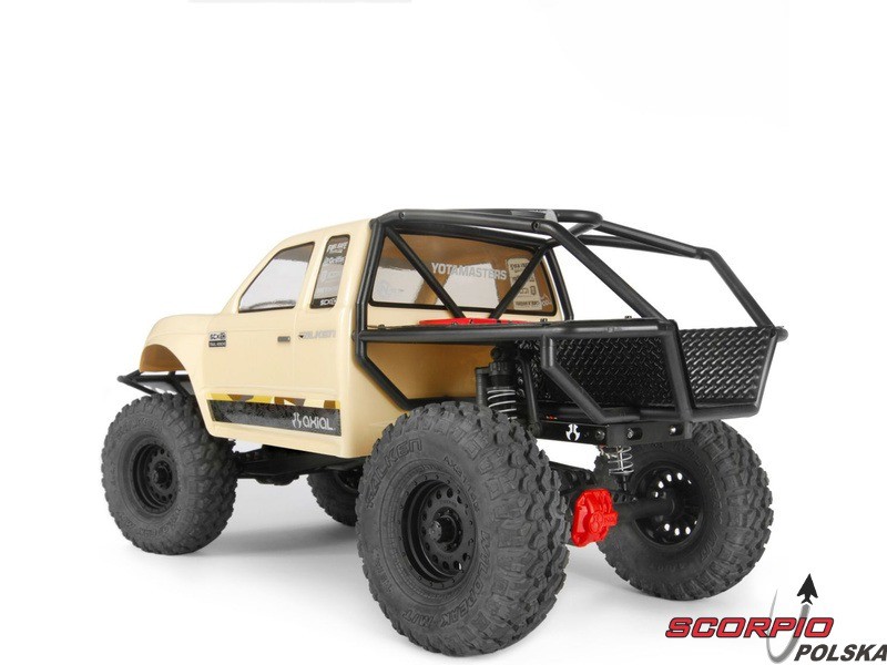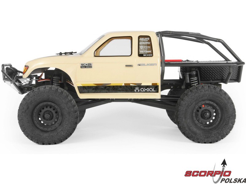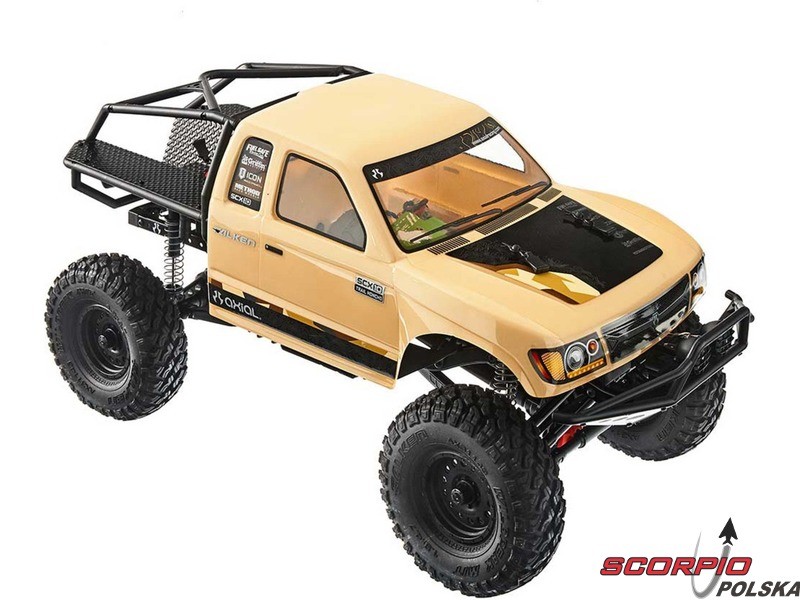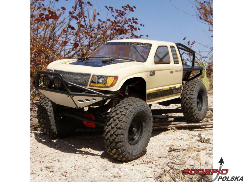 RC model popularnego auta ekspedycyjnego Axial SCX10 II Trail Honchow skali 1:10 jest kompletnie złożony i przygotowany do jazdy. Między stalowe profile ramy zainstalowane jest podwozie z przekładnią, mocowanie zawieszenia, zderzaki i wyposażenie elektro. Gotowa karoseria, aparatura RC. Model jedzie z szybkością aż 5 km/h. Przybliżony czas jazdy z LiPol 2s 5000mAh wynosi 45-60 minut.