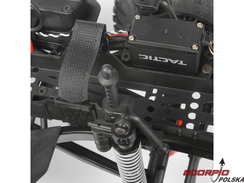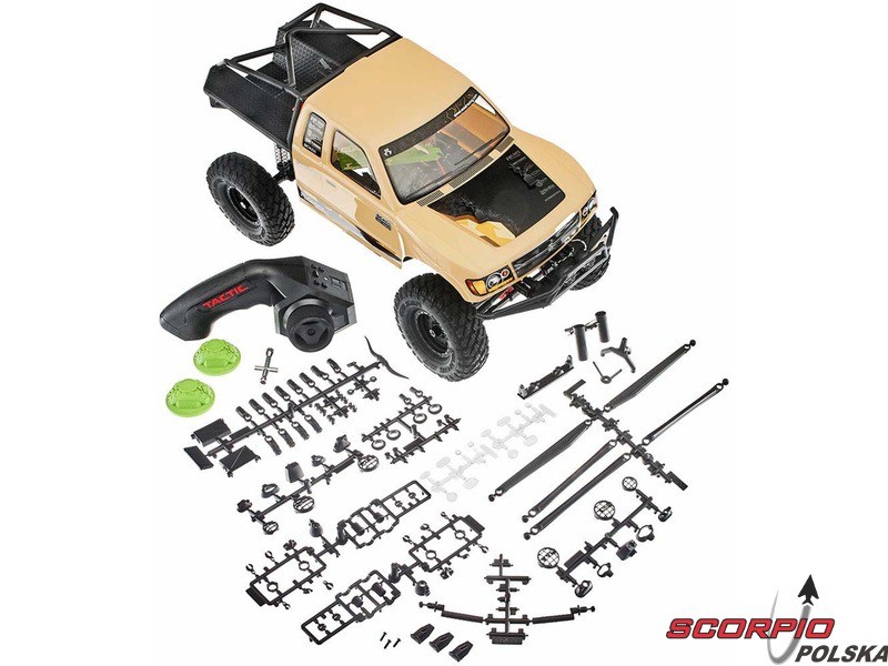 W zestawie znajduje się złożony model RC auta SCX10 II Trail Honcho z zainstalowanym regulatorem AE-5 z konektorem Deans, szczotkowym silnikiem 35T oraz serwem kierunku TSX45. Nadajnik Tactic TTX200 oraz odbiornik TR325. Gotowa karoseria. Opakowanie z plastikowymi akcesoriami jak rampy najazdowe lub makieta byczych rogów.