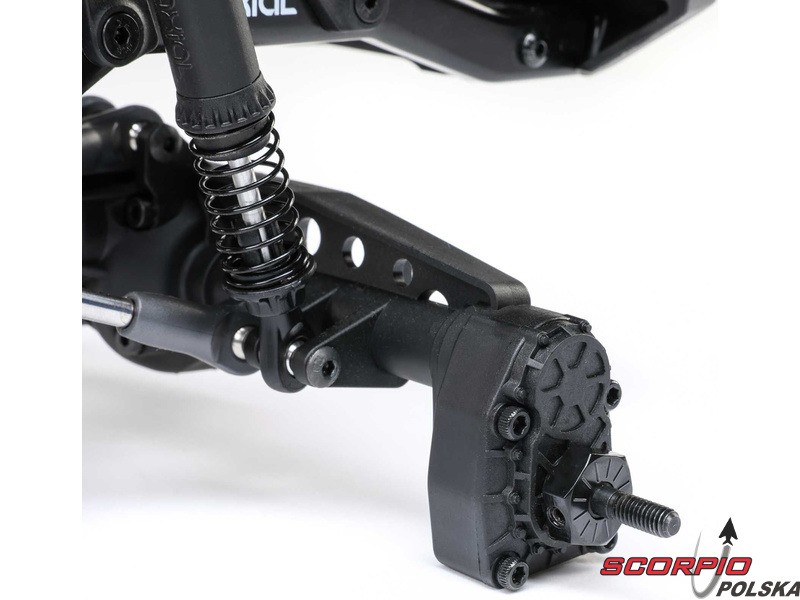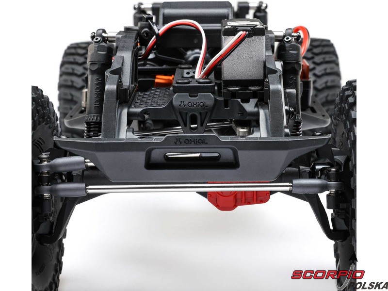 Układ napędowy składa się z silnika szczotkowego Axial Slickrock 35T i wodoodpornego* regulatora Spektrum 40A. Dzięki temu prostemu i niezawodnemu układowi można spędzić więcej czasu na trasach, a mniej na konserwacji.