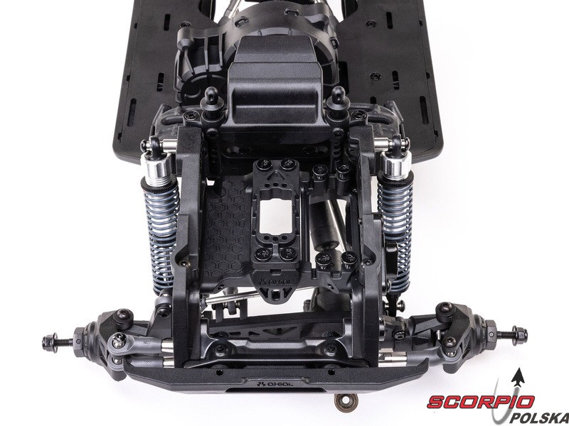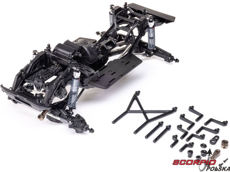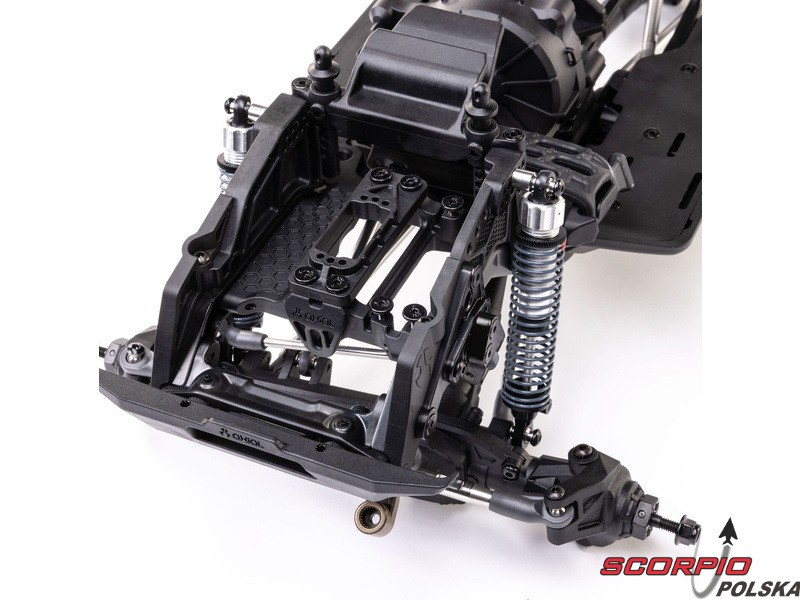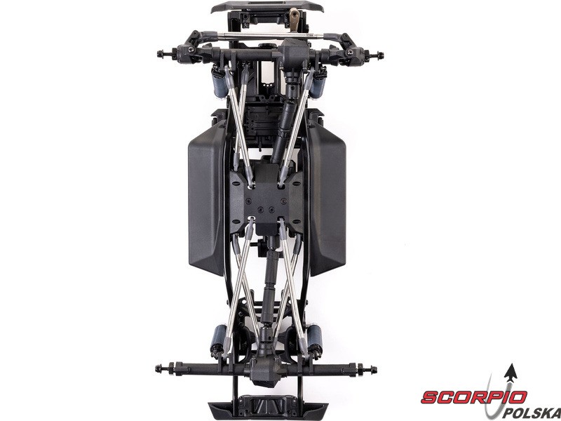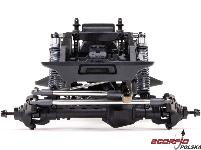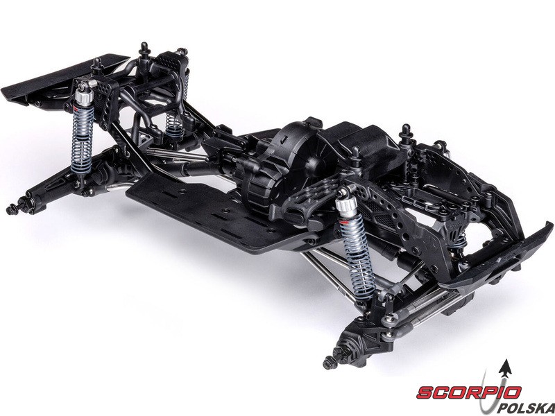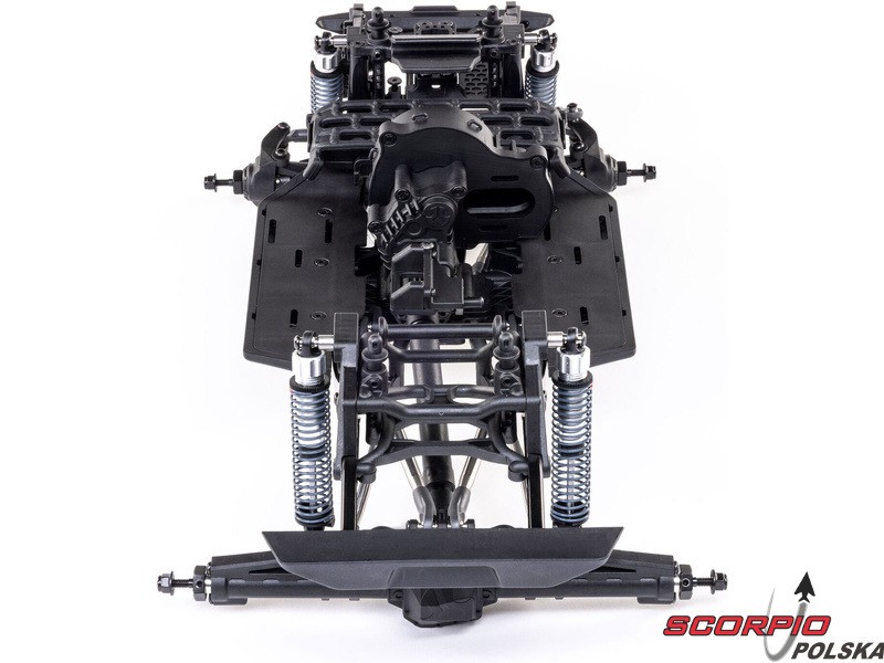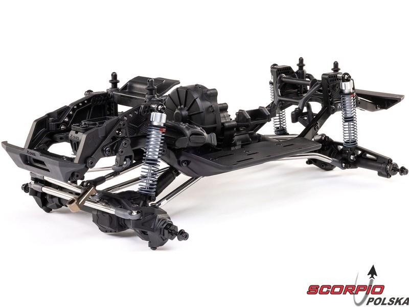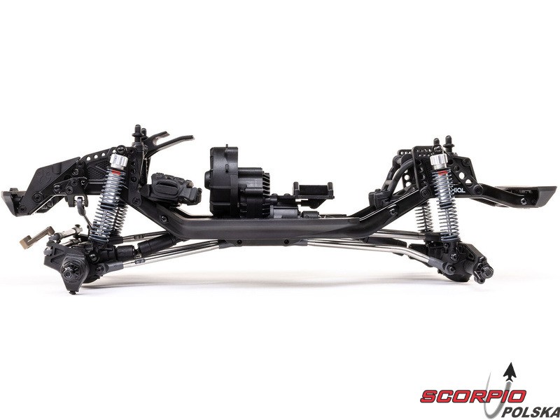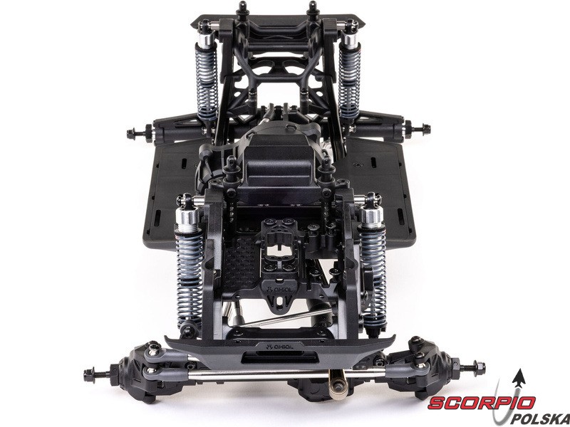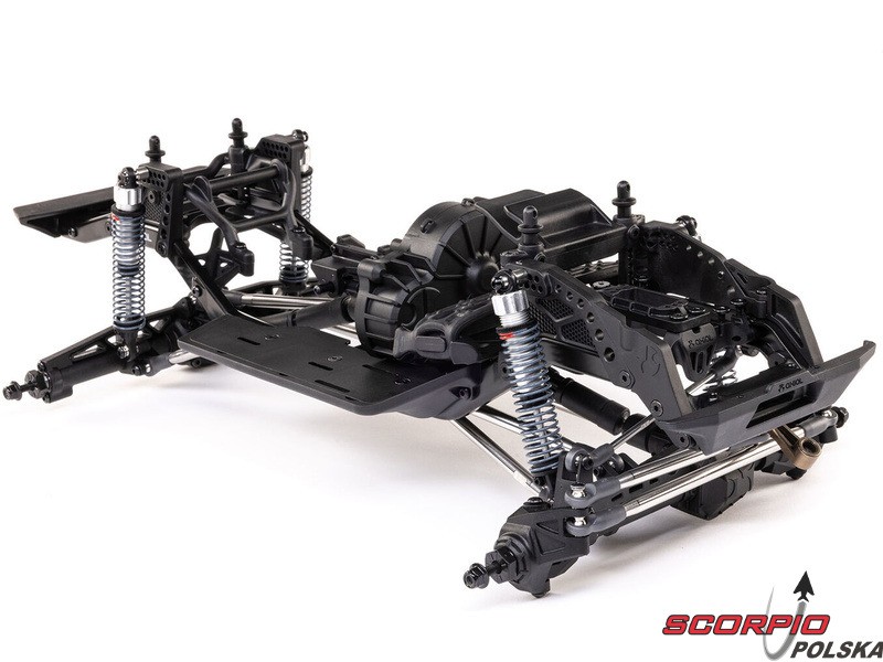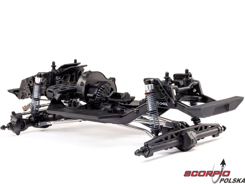 Zestaw Axial to nie tylko wersja RTR do samodzielnego montażu. To wersja ulepszona! Przekładnia LCXU umożliwia opcjonalną instalację specjalnej funkcji dla modeli typu crawler – DIG (blokada tylnej osi). Drążki zawieszenia mają średnicę 6 mm i są wykonane ze stali nierdzewnej. Nowe, wydajne wieżyczki amortyzatorów oferują kilka opcji montażu w celu optymalizacji zawieszenia. Amortyzatory można zamontować pionowo, aby uzyskać liniowe tłumienie, lub pochylić, aby uzyskać tłumienie progresywne i obniżyć środek ciężkości. Zastosowano również proste mosty AR45, a trzy regulowane przegródki na akumulatory zapewniają dużą elastyczność w zakresie zasilania i ustawienia środka ciężkości. Mocowania drążka Panharda umożliwiają również montaż mostów portalowych (sprzedawanych oddzielnie). Konstrukcja podwozia to trzypunktowe zawieszenie przednie z drążkiem Panharda oraz czteropunktowe zawieszenie tylne. Takie zawieszenie zapewnia duży skok osi i precyzyjną geometrię. Zainstalowano ukośne progi podwozia, dzięki którym model może płynnie zjeżdżać z przeszkód.