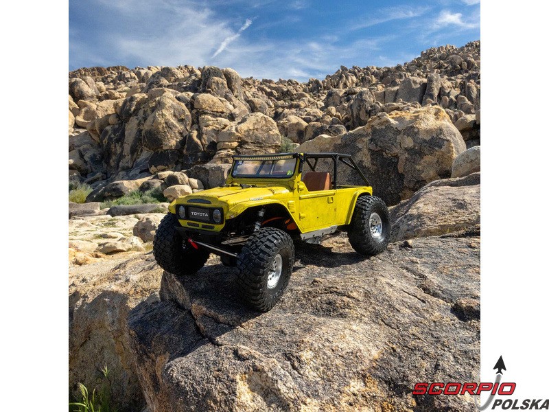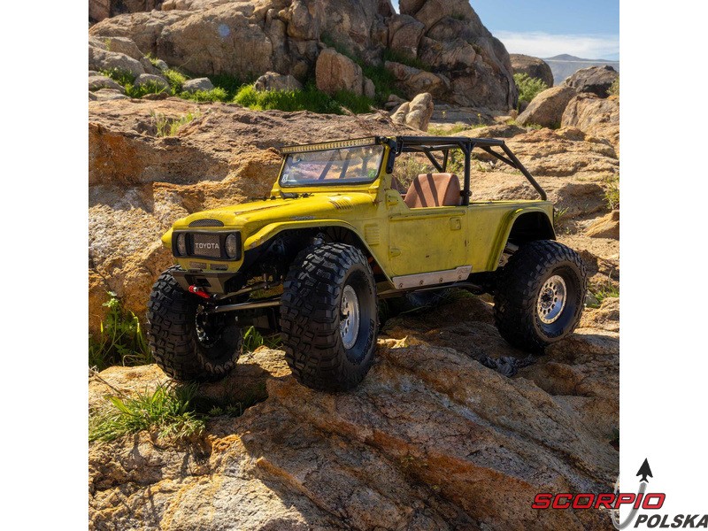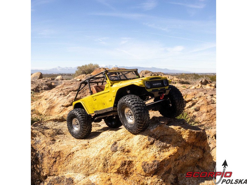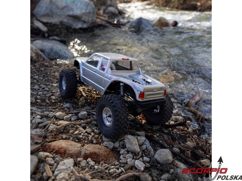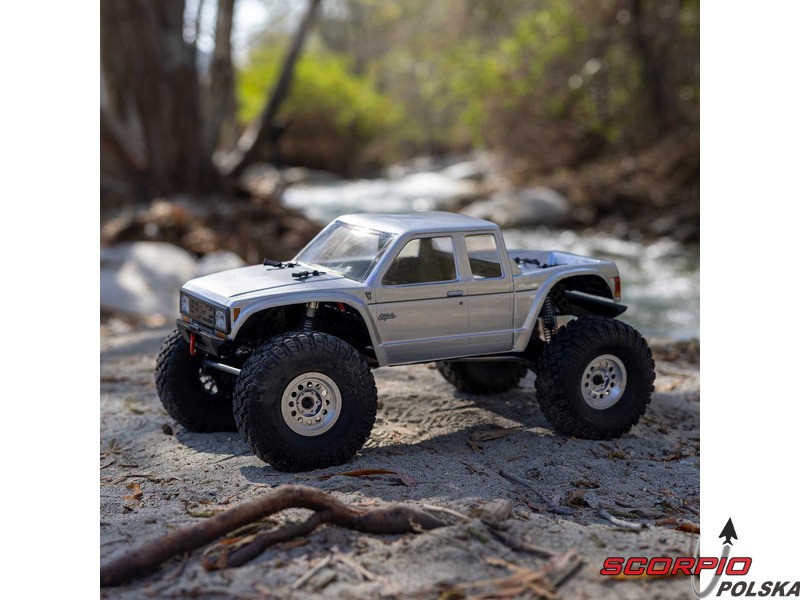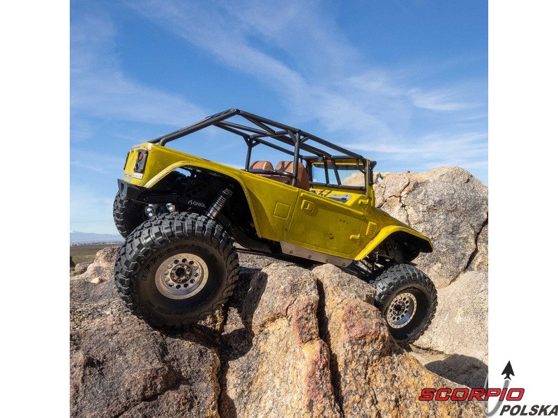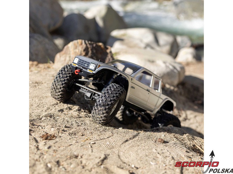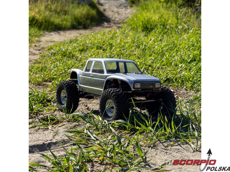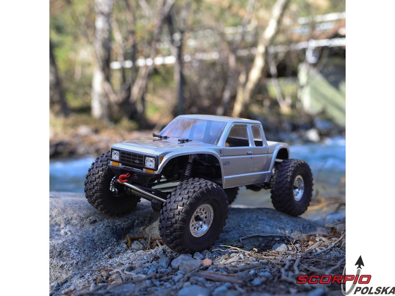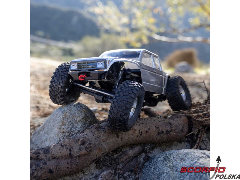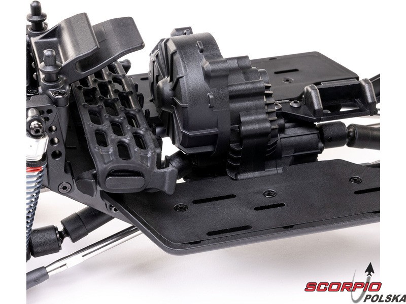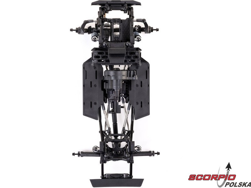 Zestaw Axial to nie tylko wersja RTR do samodzielnego montażu. To wersja ulepszona! Przekładnia LCXU umożliwia opcjonalną instalację specjalnej funkcji dla modeli typu crawler – DIG (blokada tylnej osi). Drążki zawieszenia mają średnicę 6 mm i są wykonane ze stali nierdzewnej. Nowe, wydajne wieżyczki amortyzatorów oferują kilka opcji montażu w celu optymalizacji zawieszenia. Amortyzatory można zamontować pionowo, aby uzyskać liniowe tłumienie, lub pochylić, aby uzyskać tłumienie progresywne i obniżyć środek ciężkości. Zastosowano również proste mosty AR45, a trzy regulowane przegródki na akumulatory zapewniają dużą elastyczność w zakresie zasilania i ustawienia środka ciężkości. Mocowania drążka Panharda umożliwiają również montaż mostów portalowych (sprzedawanych oddzielnie). Konstrukcja podwozia to trzypunktowe zawieszenie przednie z drążkiem Panharda oraz czteropunktowe zawieszenie tylne. Takie zawieszenie zapewnia duży skok osi i precyzyjną geometrię. Zainstalowano ukośne progi podwozia, dzięki którym model może płynnie zjeżdżać z przeszkód.