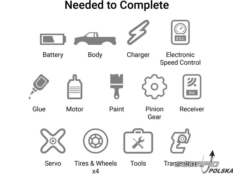 Jeśli zamierzasz zbudować model SCX10 III Base Camp 1:10 4WD, do jego ukończenia potrzebne będą następujące elementy: