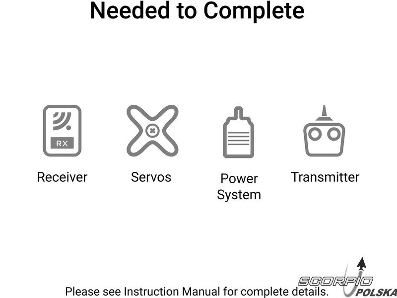 Model jest przeznaczony wyłącznie do zasilania silnikiem spalinowym o pojemności 10-11 cm3 lub silnikiem elektrycznym LiPo 4S-6S, który należy uzupełnić zgodnie z własnym wyborem. Konieczne jest również dodanie serwomechanizmów, odpowiedniej elektroniki i aparatury RC. Zalecane akcesoria są wymienione poniżej: