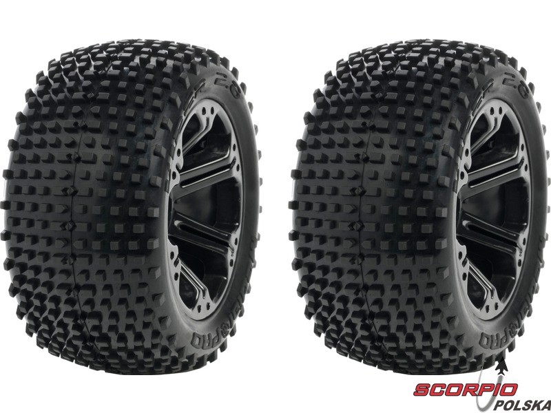 Komplet kół Medial Pro 2.8" Matrix z tarczą Addict pro do modeli samochodów RC. Rozmiar tarczy ø 71 x 49 mm, rozmiar opony ø 109 x 53 mm, sześciokąt 12 mm z przełożeniem 29 mm, kolor czarny, rodzaj mieszanki - miękka.