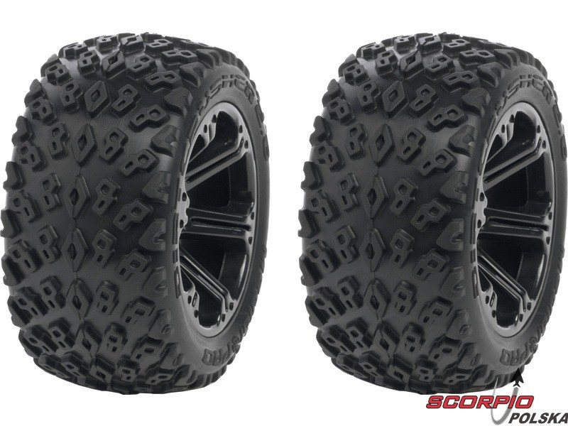 Kompletne koła Medial Pro 2.8” Dirt Crusher z felgami Addict odpowiednie na przednią oś do modelu Traxxas 1/ Nitro Sport, Nitro Rustler oraz Nitro Stampede. Rozmiar felgi to Ø71x49 mm, rozmiar opon ø111x53 mm, osadzenie na łożysku 5x11 mm.