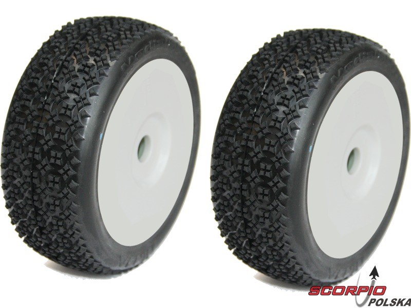 Komplet kół Medial Pro 3.3" Ninja z tarczą Rex Buggy pro do modeli samochodów RC. Rozmiar tarczy ø 84 x 42 mm, rozmiar opony ø 115 x 44 mm, sześciokąt 17 mm z przełożeniem 34 mm, kolor biały, rodzaj mieszanki - M2 twarda.