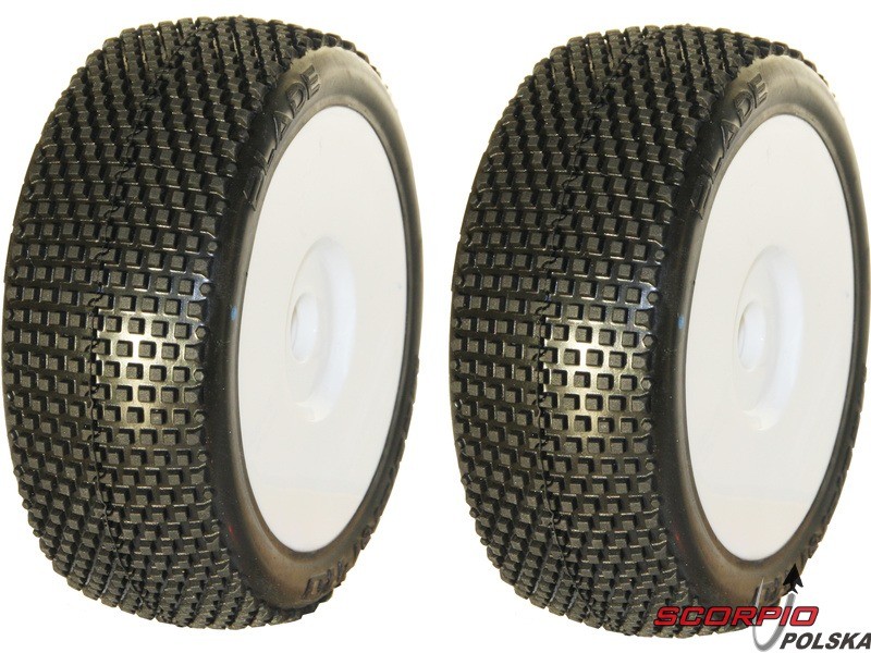 Komplet kół Medial Pro 3.3" Blade z tarczą Rex Buggy pro do modeli samochodów RC. Rozmiar tarczy ø 84 x 42 mm, rozmiar opony ø 115 x 44 mm, sześciokąt 17 mm z przełożeniem 34 mm, kolor biały, rodzaj mieszanki - M2 twarda.