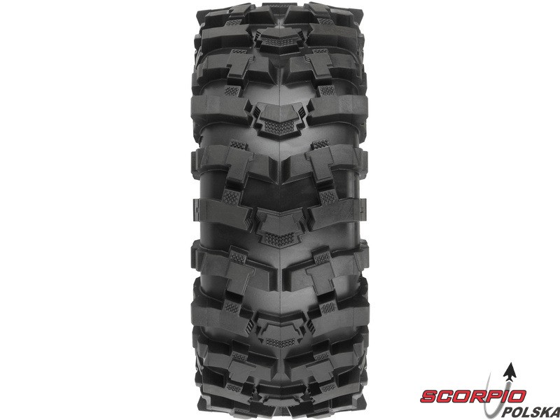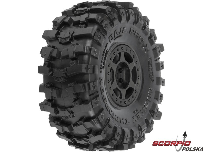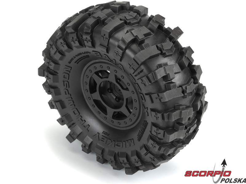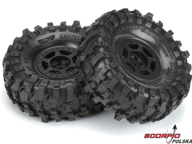 Kompletne koła Pro-Line do modeli crawlerów RC 1:10, wyprawowych. Wymiary ⌀123x51 mm. 3-częściowa felga Holcomb, ułatwiająca montaż opon, kolor czarny. Opony 1.9 Mickey Thompson Baja Pro X", twardość mieszanki G8 (miękka). Piasta to sześciokąt 12mm.