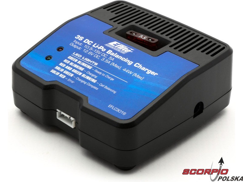 Ładowarka do akumulatorów 3S LiPol ze złączem serwisowym JST-XH, prąd ładowania 3,5A z ograniczeniem mocy do 44W, wyposażona w automatykę i bezpiecznik. Ładowarka zasilana jest z sieci 12 V (brak w zestawie).