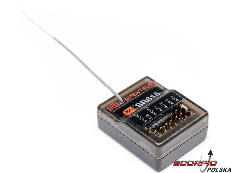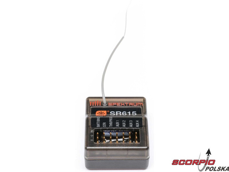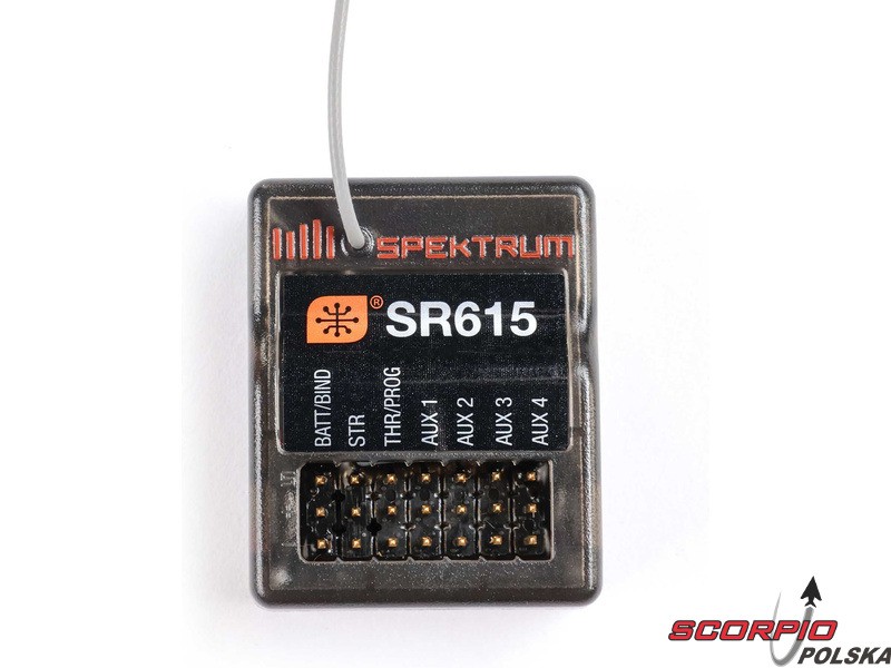6-kanałowy odbiornik Spektrum SR615 DSMR 2,4 GHz w wersji mikro, z prędkością ramkową 5,5 ms, zapewnia szybsze połączenie z niewielkim opóźnieniem. Możliwość wyboru SmartSafe™ lub „Gas” Failsafe. Wodoodporna konstrukcja. Obsługa transmisji telemetrii Smart. Parowanie za pomocą konektora parującego.