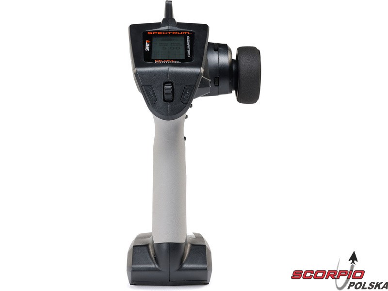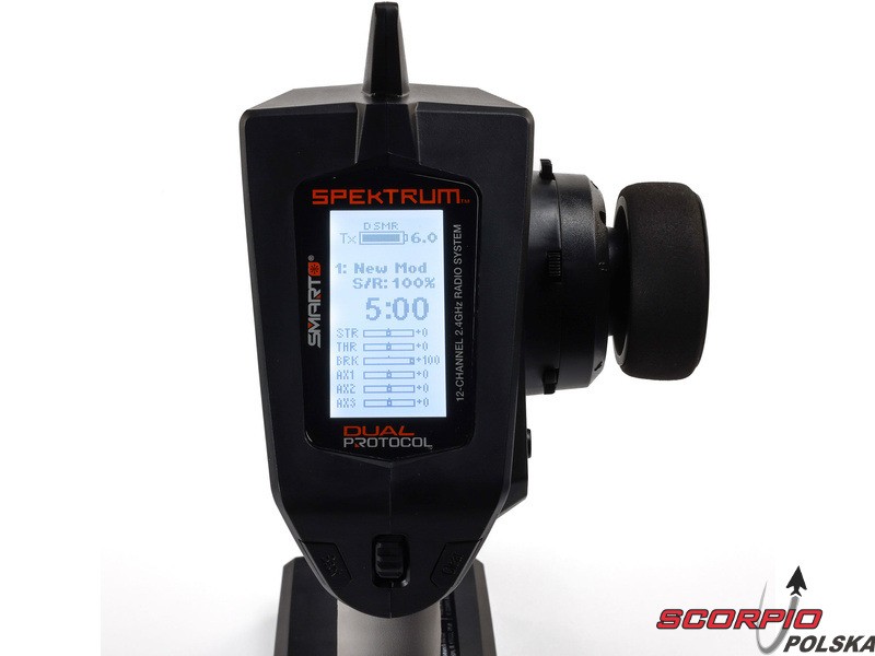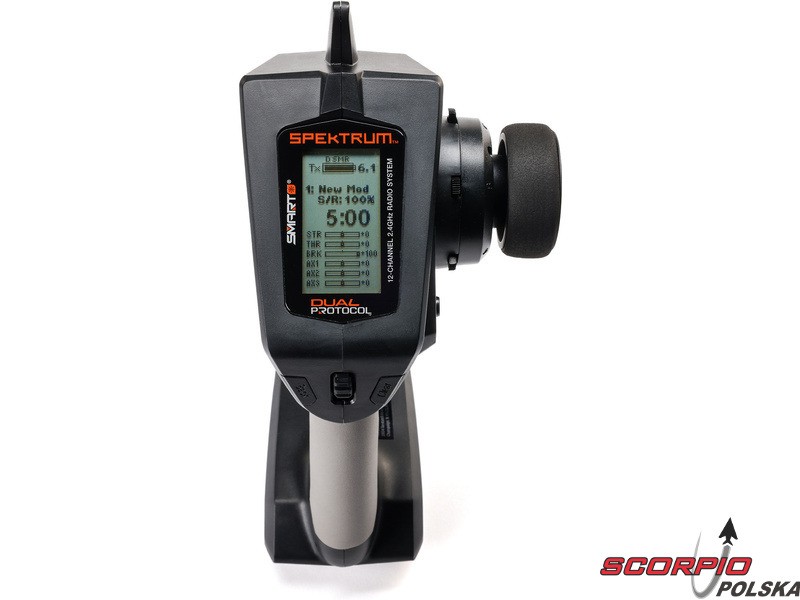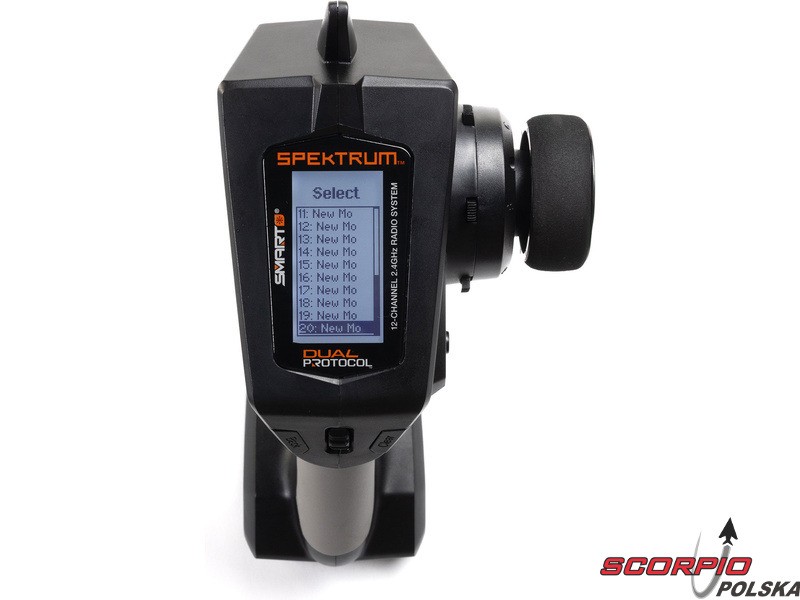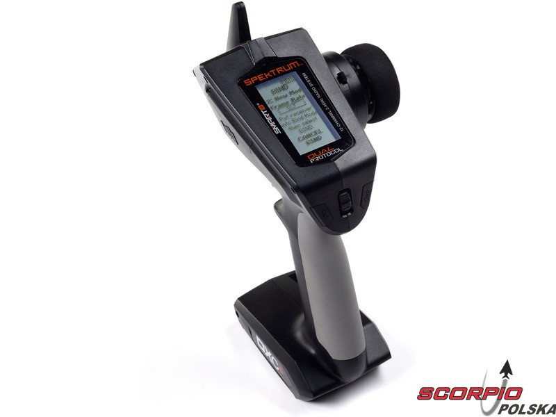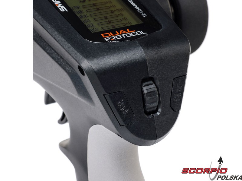 Pistoletowy 12 kanałowy nadajnik Spektrum DXC+ z podwójnym protokołem DSMR+ i SLT oraz obsługą technologii Spektrum Smart. Pamięć na 20 modeli, duży wyświetlacz LCD, intuicyjna obsługa, szerokie możliwości ustawień.