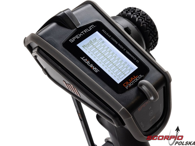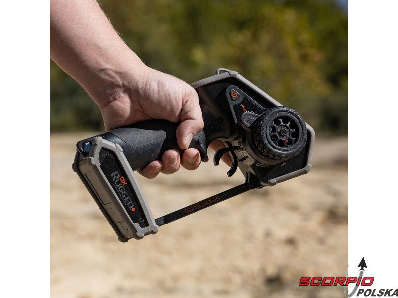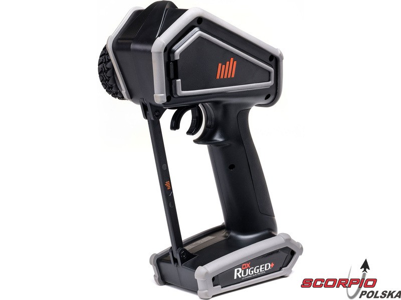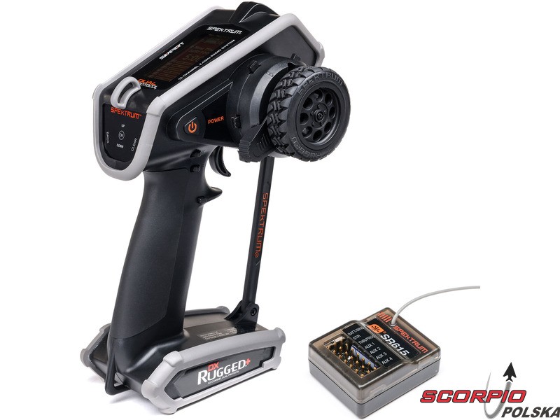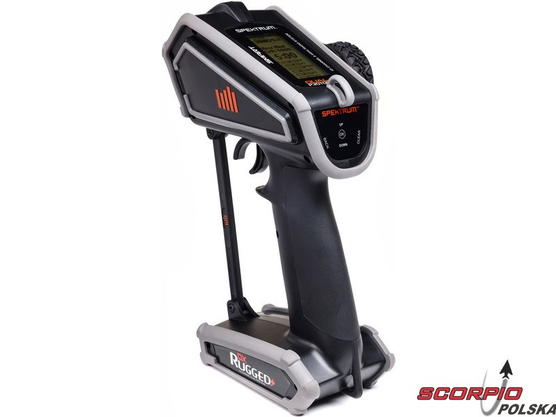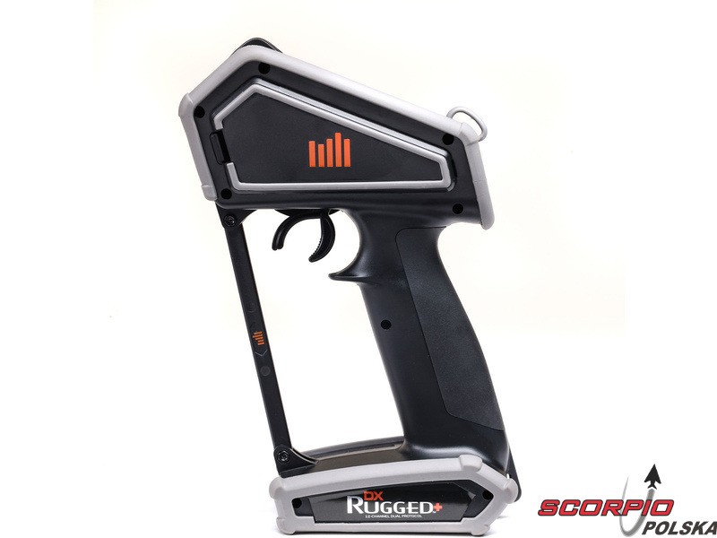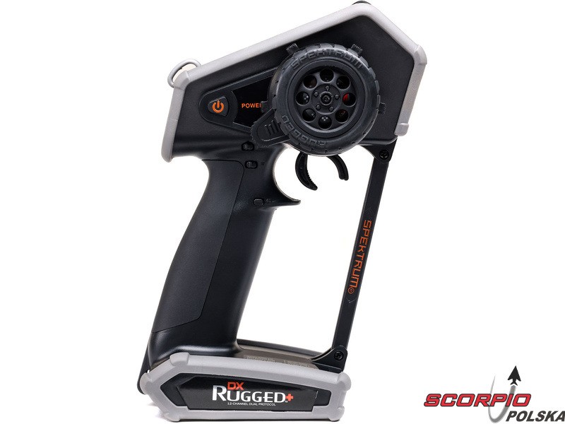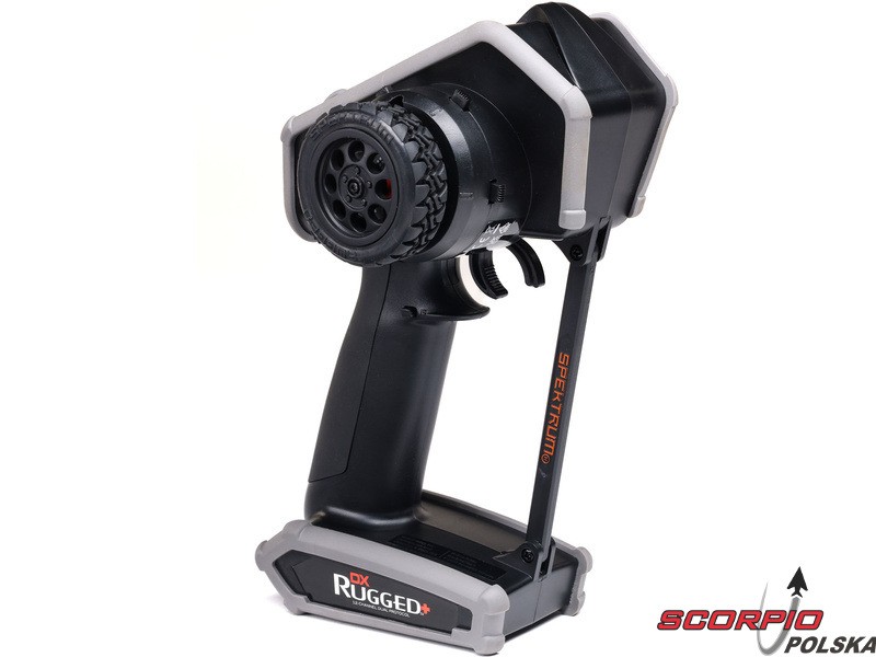 Pistoletowy 12-kanałowy nadajnik Spektrum DX Rugged+ z podwójnym protokołem DSMR+ i SLT, który umożliwia sterowanie szeroką gamą modeli RC z wieloma funkcjami. Nadajnik zawiera technologię Spektrum Smart, a przy użyciu dodatkowych komponentów Spektrum zyskuje się doskonały przegląd modelu, w tym dane telemetryczne i możliwość bezpośredniego ustawienia regulatora Firma Prog. Nadajnik ma proste i logicznie zorganizowane menu, pamięć na 20 modeli, duży, przejrzysty wyświetlacz i niewielką masę. Wśród nowych funkcji wersji DSMR+ znajduje się obsługa wielu różnych mikserów, przełączników logicznych, hamulca awaryjnego, a także możliwość zmiany wejść i wykonywania innych zaawansowanych operacji programowania.