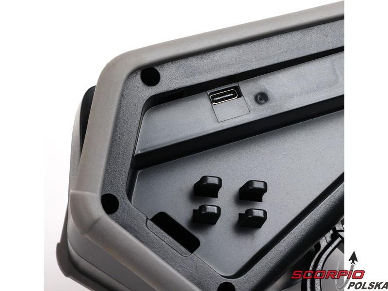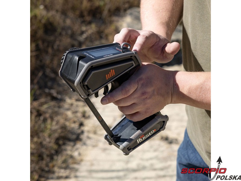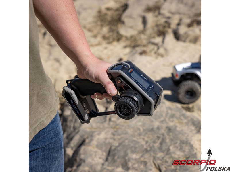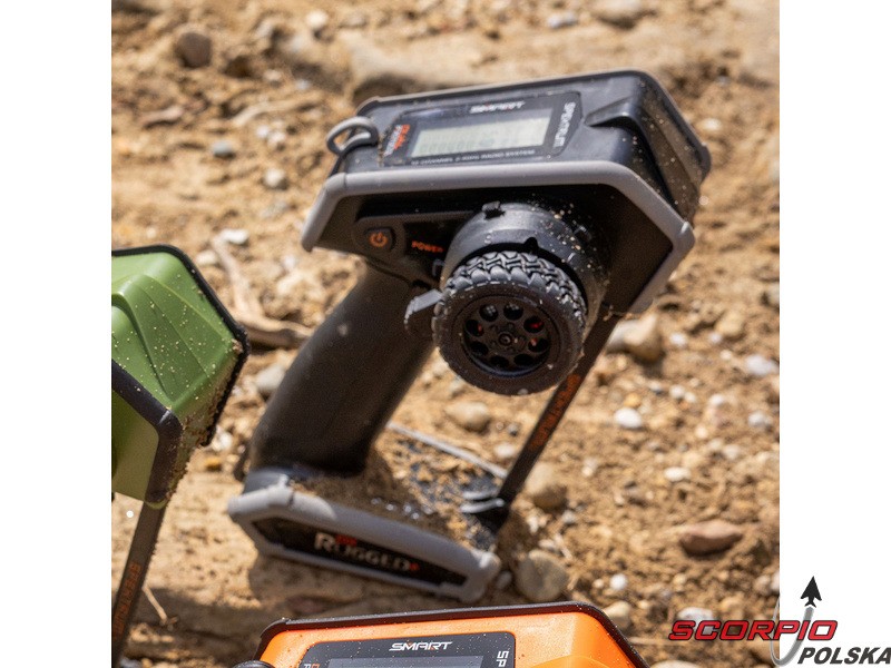 Nadajnik w wersji Rugged charakteryzuje się zwiększoną odpornością na uszkodzenia mechaniczne, a także znacznie zwiększoną odpornością na wilgoć. Zostanie to docenione nie tylko podczas jazdy modelami RC w trudnych warunkach, ale także podczas normalnego użytkowania. Nadajnik Rugged zawiera profilowane zderzaki z termoplastycznego poliuretanu (TPU), które otaczają obudowę i chronią ją przed upadkami, a także dotykowy interfejs sterowania, zabezpieczenie przed przewróceniem i solidną konstrukcję. Do poruszania się po menu nadajnika służy innowacyjny panel dotykowy, który zapewnia większą odporność na wilgoć i zabrudzenia. Wystarczy przesunąć palcem po panelu sterowania i kliknąć, aby wybrać opcję z menu. Podobnie jak jego poprzednik, nadajnik charakteryzuje się doskonałą ergonomią.
