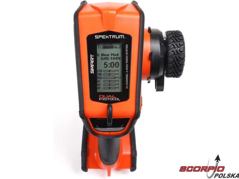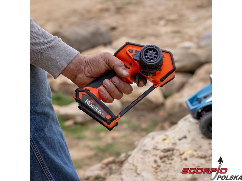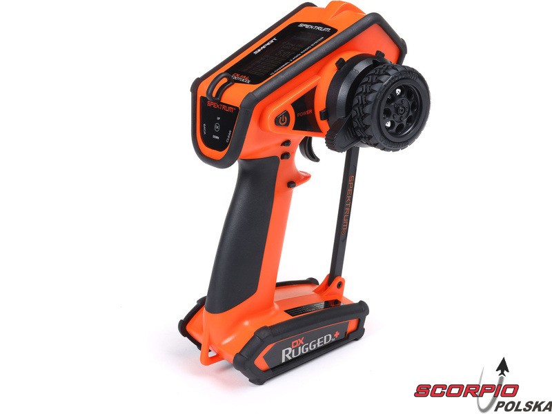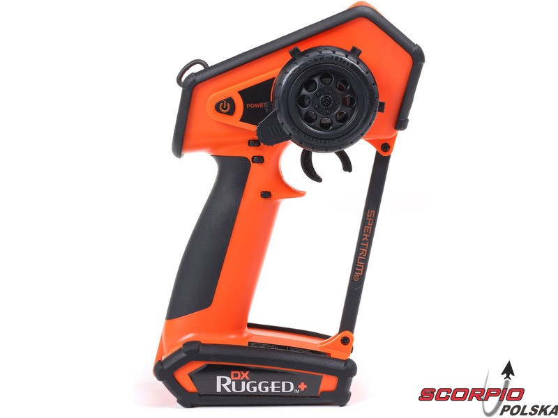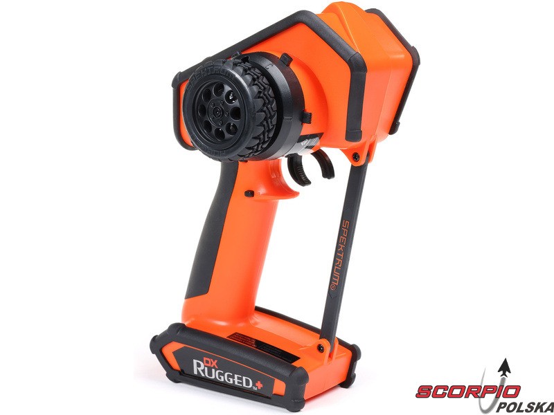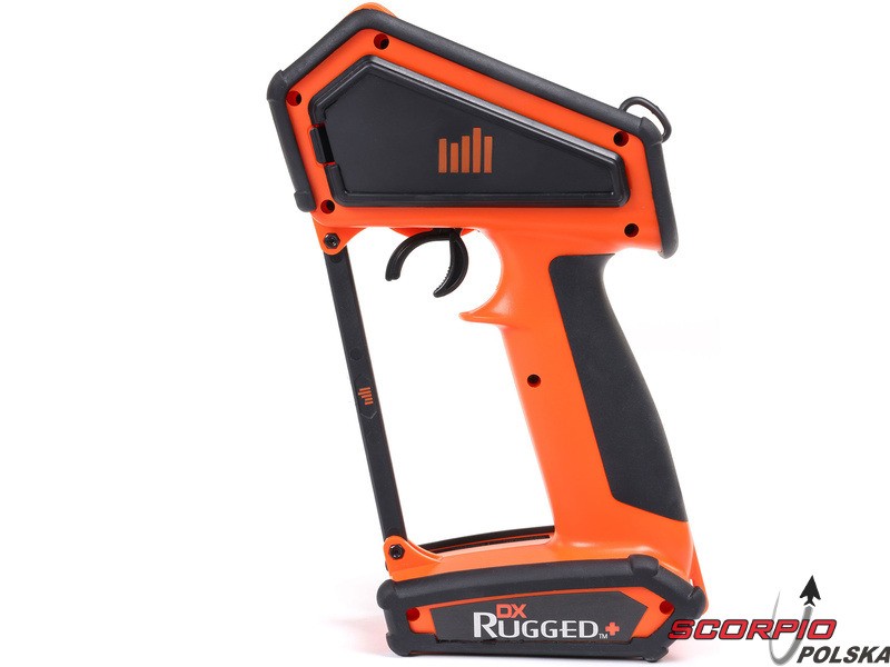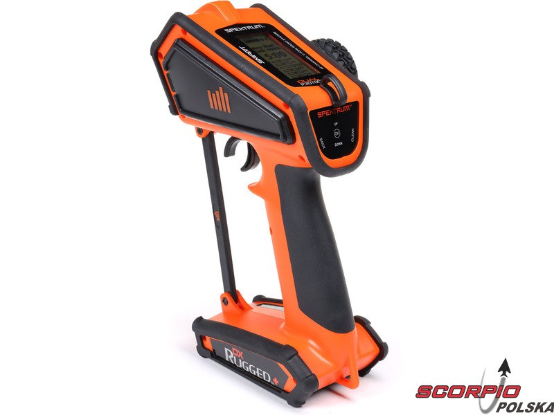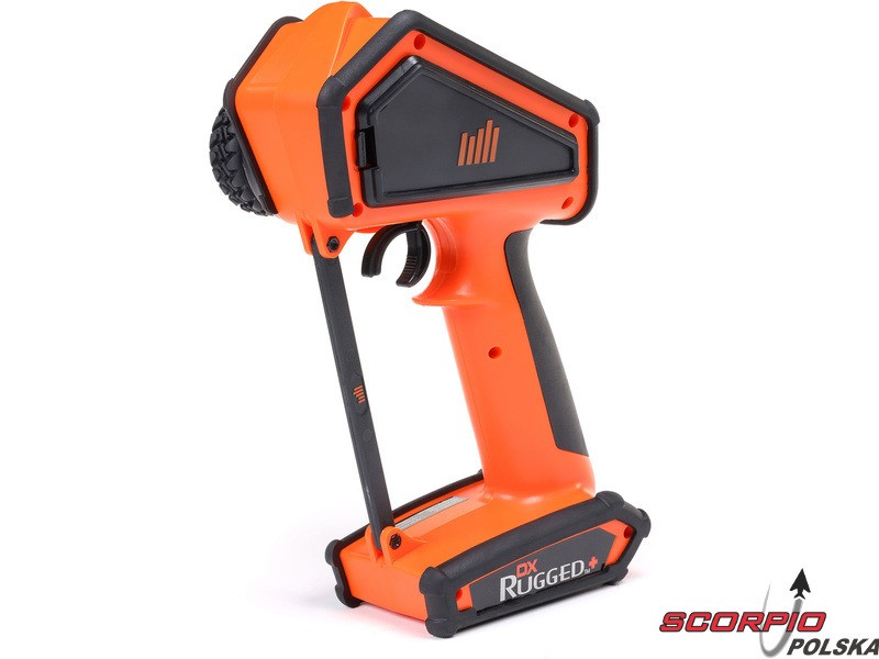 Pistoletowy 12-kanałowy nadajnik Spektrum DX Rugged+ pomarańczowy z podwójnym protokołem DSMR+ i SLT, który umożliwia sterowanie szeroką gamą modeli RC z wieloma funkcjami. Nadajnik zawiera technologię Spektrum Smart, a przy użyciu dodatkowych komponentów Spektrum zyskuje się doskonały przegląd modelu, w tym dane telemetryczne i możliwość bezpośredniego ustawienia regulatora Firma Prog. Nadajnik ma proste i logicznie zorganizowane menu, pamięć na 20 modeli, duży, przejrzysty wyświetlacz i niewielką masę. Wśród nowych funkcji wersji DSMR+ znajduje się obsługa wielu różnych mikserów, przełączników logicznych, hamulca awaryjnego, a także możliwość zmiany wejść i wykonywania innych zaawansowanych operacji programowania.