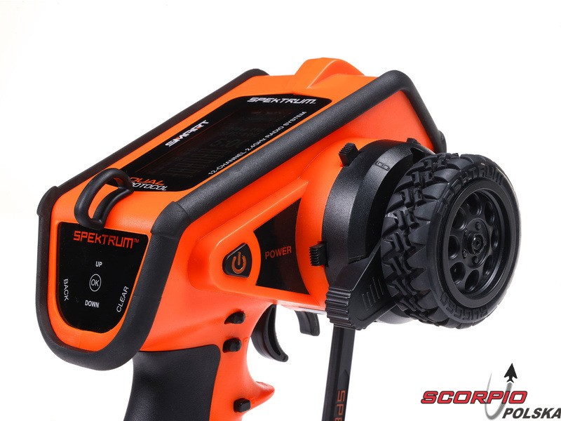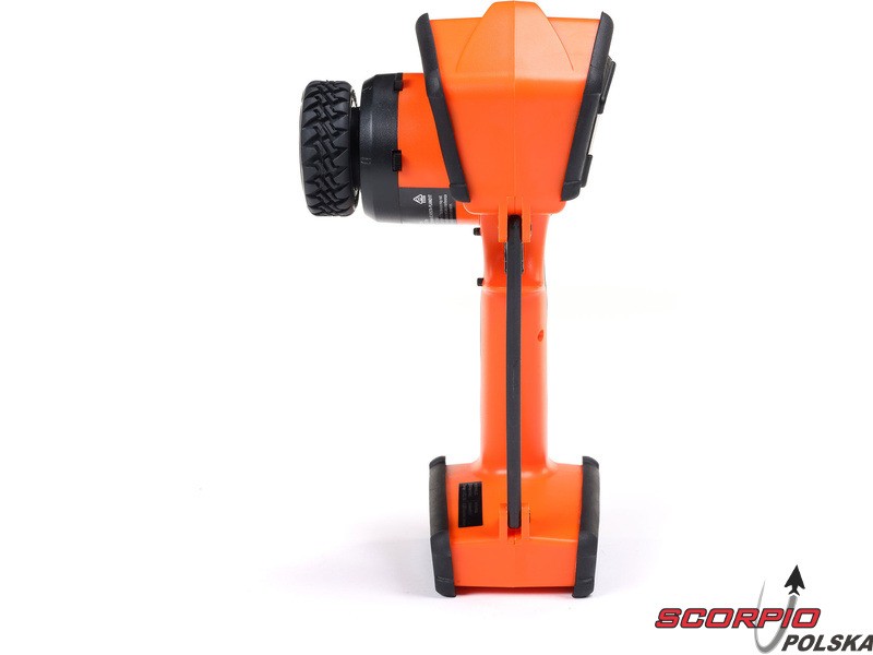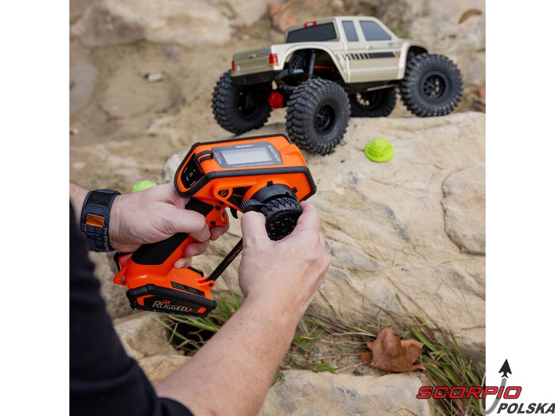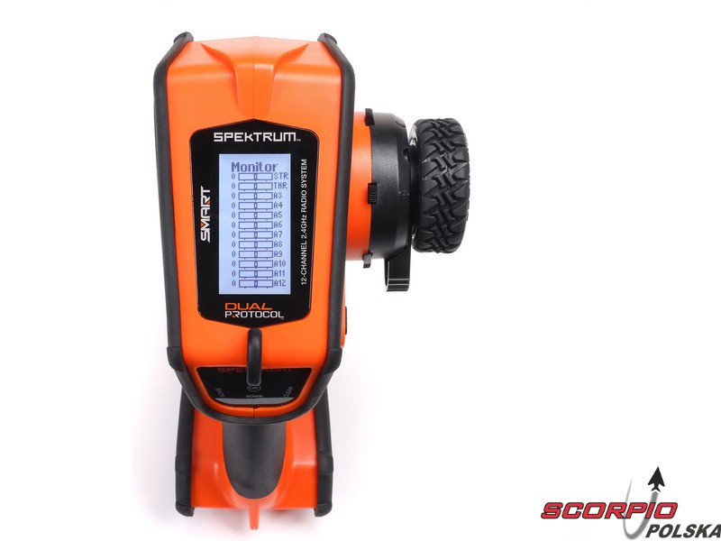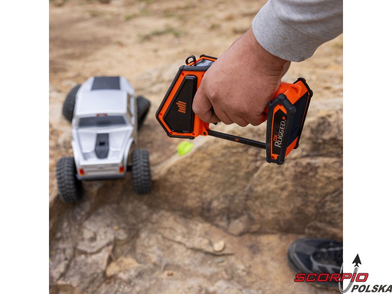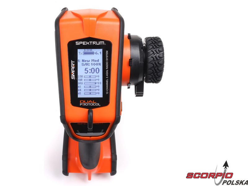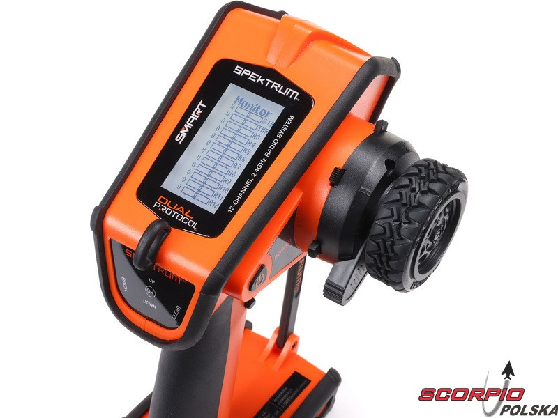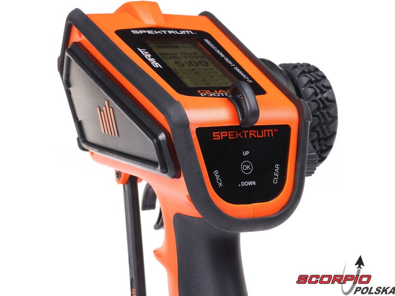 Pistoletowy 12-kanałowy nadajnik Spektrum DX Rugged+ pomarańczowy z podwójnym protokołem DSMR+ i SLT, który umożliwia sterowanie szeroką gamą modeli RC z wieloma funkcjami. Nadajnik zawiera technologię Spektrum Smart, a przy użyciu dodatkowych komponentów Spektrum zyskuje się doskonały przegląd modelu, w tym dane telemetryczne i możliwość bezpośredniego ustawienia regulatora Firma Prog. Nadajnik ma proste i logicznie zorganizowane menu, pamięć na 20 modeli, duży, przejrzysty wyświetlacz i niewielką masę. Wśród nowych funkcji wersji DSMR+ znajduje się obsługa wielu różnych mikserów, przełączników logicznych, hamulca awaryjnego, a także możliwość zmiany wejść i wykonywania innych zaawansowanych operacji programowania.