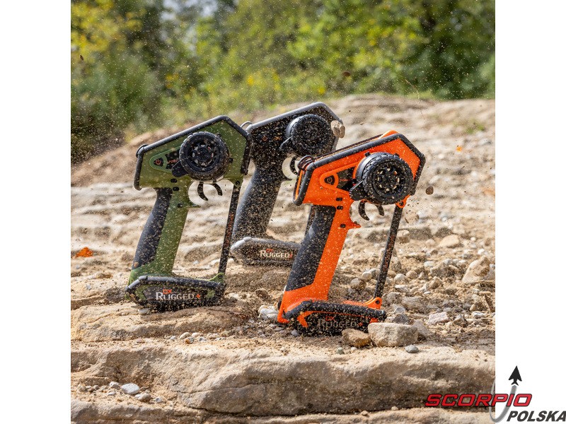 Nadajnik w wersji Rugged charakteryzuje się zwiększoną odpornością na uszkodzenia mechaniczne, a także znacznie zwiększoną odpornością na wilgoć. Zostanie to docenione nie tylko podczas jazdy modelami RC w trudnych warunkach, ale także podczas normalnego użytkowania. Nadajnik Rugged zawiera profilowane zderzaki z termoplastycznego poliuretanu (TPU), które otaczają obudowę i chronią ją przed upadkami, a także dotykowy interfejs sterowania, zabezpieczenie przed przewróceniem i solidną konstrukcję. Do poruszania się po menu nadajnika służy innowacyjny panel dotykowy, który zapewnia większą odporność na wilgoć i zabrudzenia. Wystarczy przesunąć palcem po panelu sterowania i kliknąć, aby wybrać opcję z menu. Podobnie jak jego poprzednik, nadajnik charakteryzuje się doskonałą ergonomią.