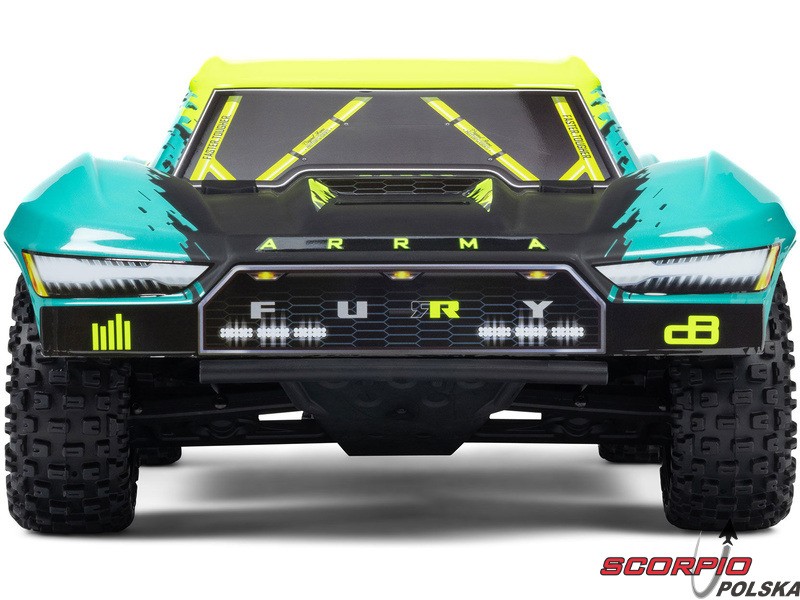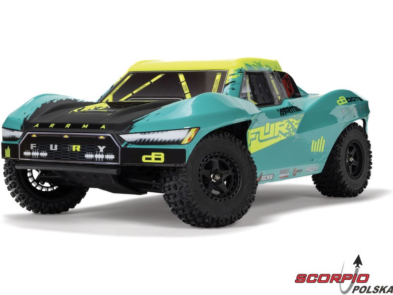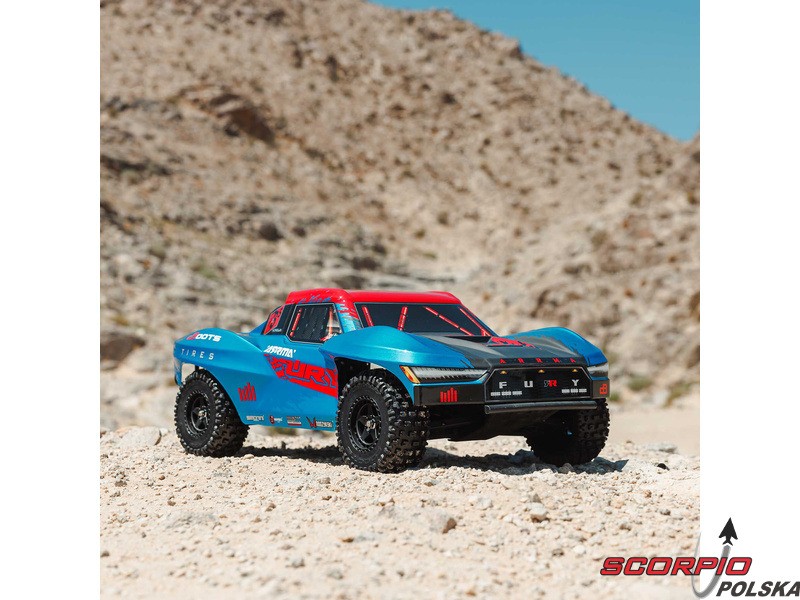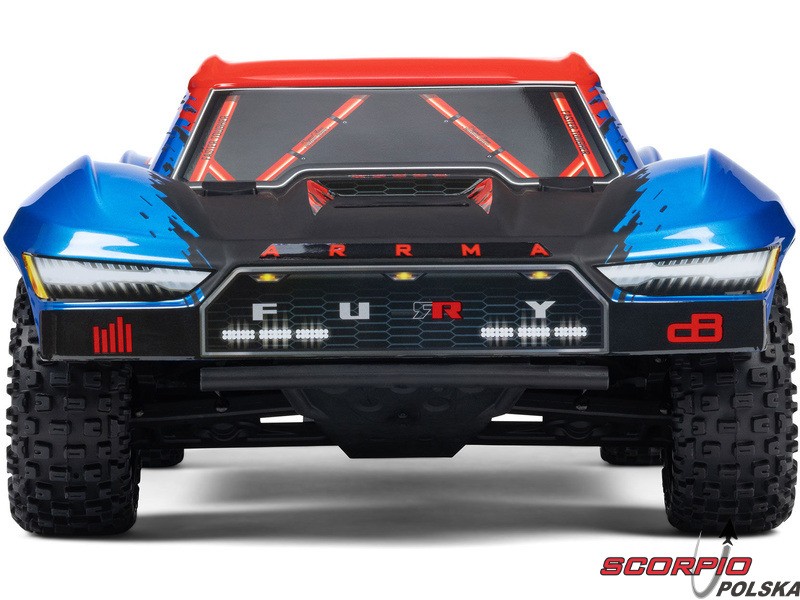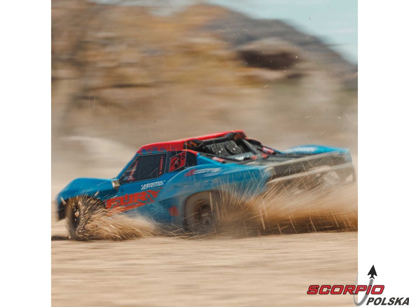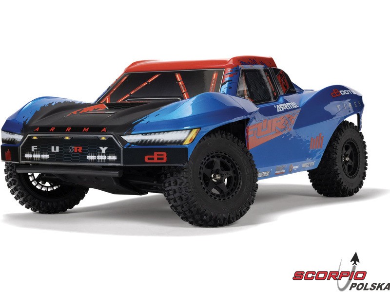 RC model auta Arrma Fury 223S BLX w skali 1:10, z napędem 2WD, mocnym silnikiem bezszczotkowym i prędkością do 80 km/h. Niezależne zawieszenie, amortyzatory olejowe, jednostka sterująca Spektrum 45A SLT 2-3S LiPo, elektroniczna stabilizacja DSC.