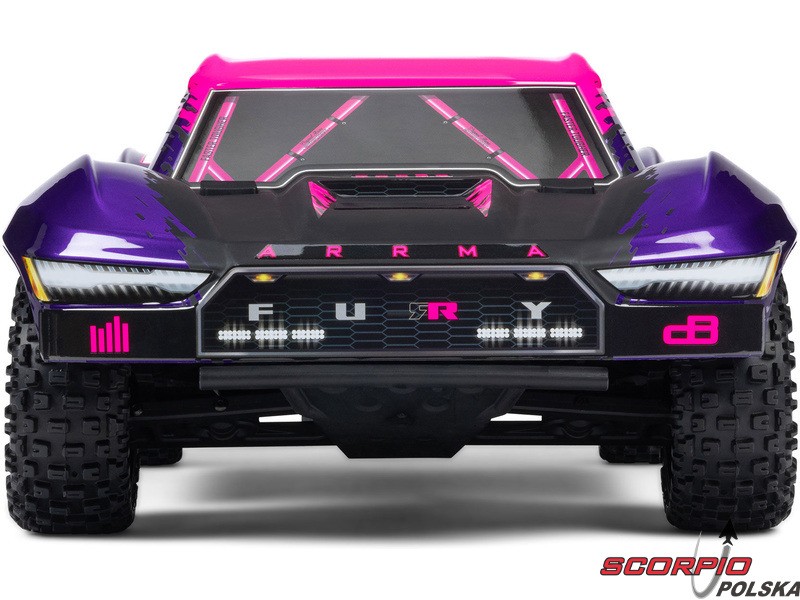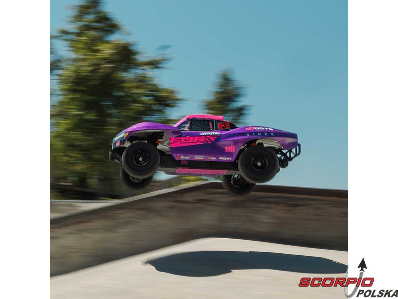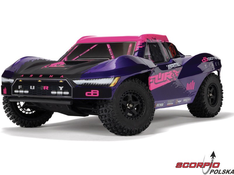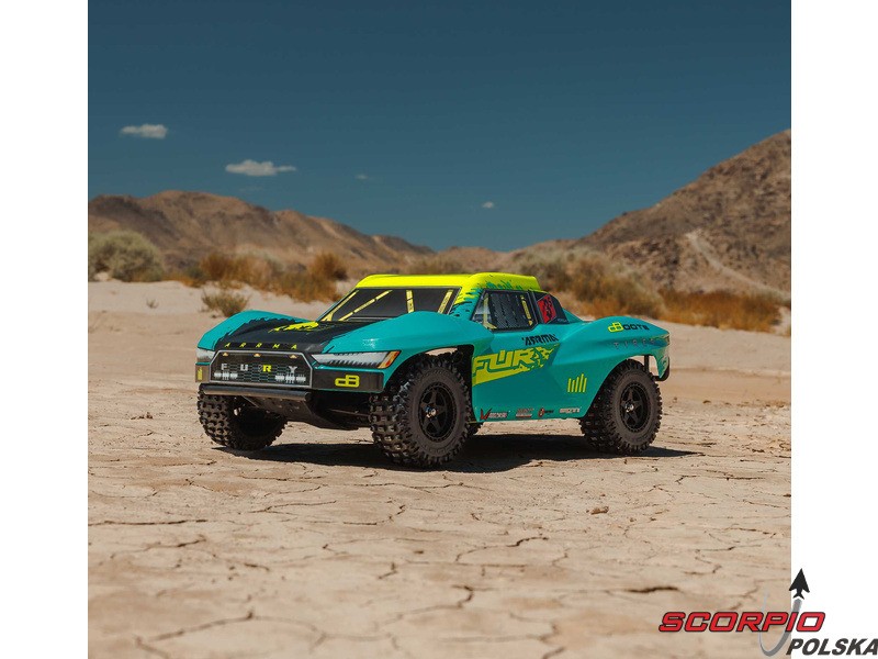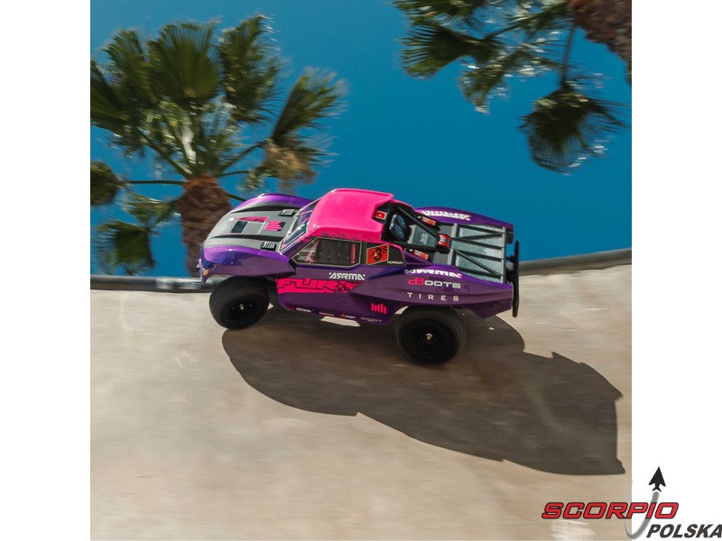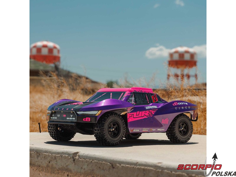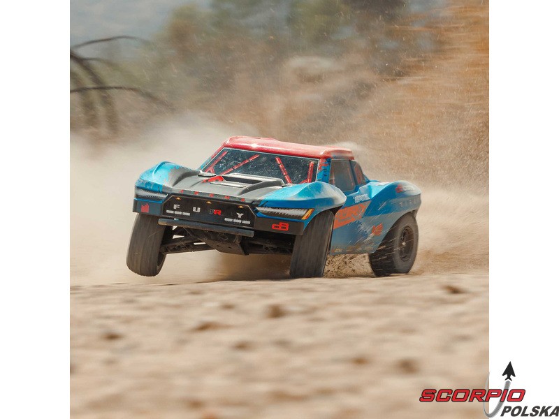 RC model auta Arrma Fury 223S BLX w skali 1:10, z napędem 2WD, mocnym silnikiem bezszczotkowym i prędkością do 80 km/h. Niezależne zawieszenie, amortyzatory olejowe, jednostka sterująca Spektrum 45A SLT 2-3S LiPo, elektroniczna stabilizacja DSC.