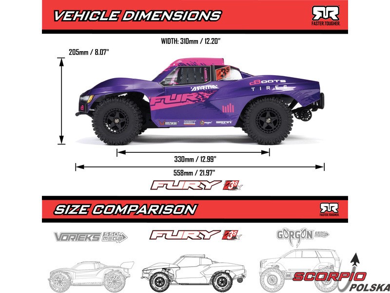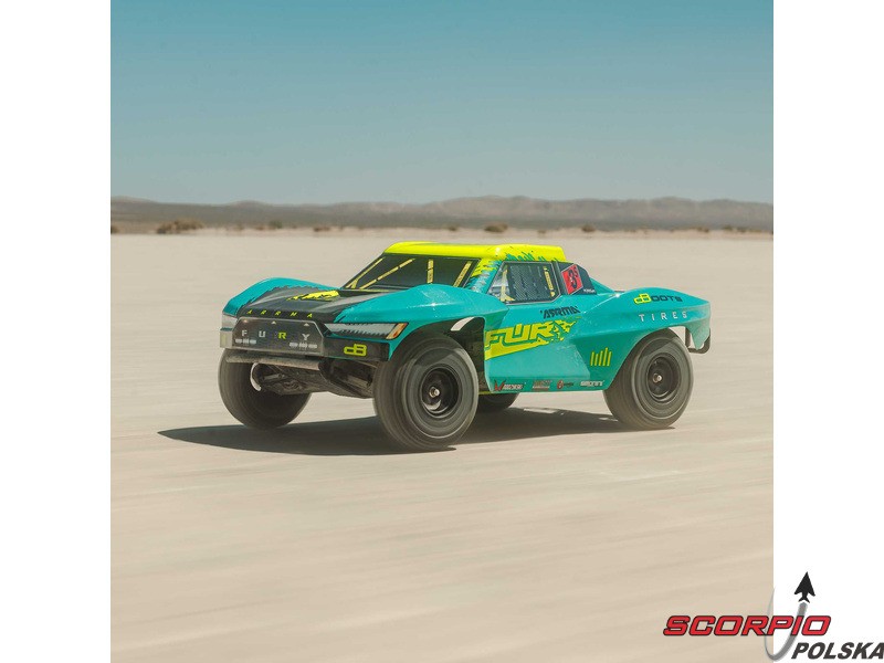 Fury ma klasyczną konstrukcję samochodu na krótki tor z kołami pokrytymi karoserią i bocznymi wzmocnieniami Nerf, dzięki czemu nie trzeba się martwić o potencjalne wstrząsy. Niskie podwozie pozwala na pokonywanie zakrętów z dużą prędkością. Model nadaje się na twarde nawierzchnie, żwir i niską trawę. Kompozytowe podwozie może również wytrzymać silne uderzenia. Zastosowane metalowe koła zębate są wystarczająco wytrzymałe do napędu trójfazowego. Maksymalną przyczepność zapewniają sprawdzone opony dBoots Fortress SC. Nadajnik Spektrum SLT zapewnia bezpieczną, bezawaryjną pracę, a wodoodporne * komponenty - regulator/odbiornik Spektrum 2 w 1 44A i serwomechanizm Spektrum S681 o wysokim momencie obrotowym - są używane w modelu do bezproblemowej jazdy.
