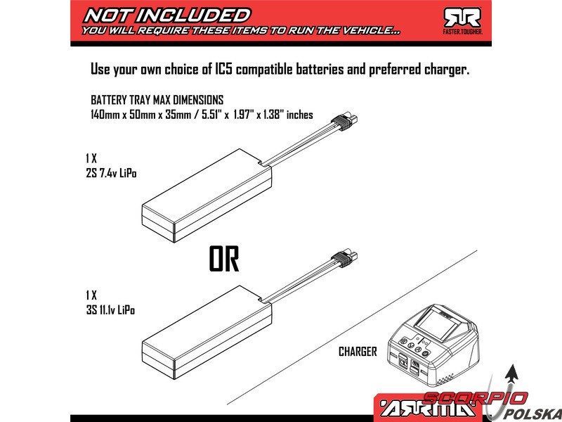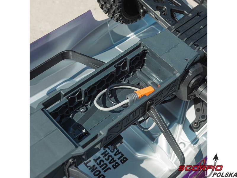 Model może być zasilany z 2 do 3 ogniwowych akumulatorów LiPol lub 7-ogniwowych akumulatorów NiMH. Akumulator powinien być wyposażony w złącze EC5 lub IC5. Do normalnej jazdy polecamy 2-ogniwowy akumulator LiPo (7,4 V).