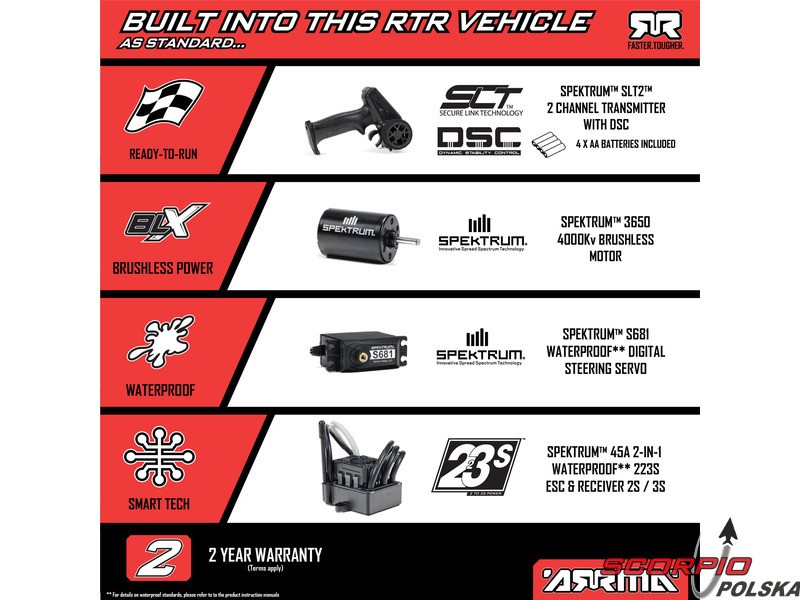 Zestaw zawiera zmontowany model RC auta Arrma Fury 223S BLX 2WD 1:10 z zainstalowanymi komponentami: Spektrum silnik bezszczotkowy 4000 Kv, jednostka sterująca Spektrum SLT 2v1 reg. 45A DSC, Spektrum serwo S681. Nadajnik Spektrum SLT2 2.4GHz, 4x baterie AA do nadajnika, śrubokręty imbusowe, klucz wielofunkcyjny, podkładki pod amortyzatory. Instrukcja EN, DE, FR.