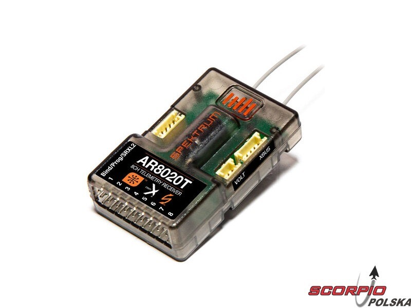 8-kanałowy odbiornik Spektrum™ AR8020T jest odbiornikiem obsługującym DSM2® i DSMX® z kompaktowymi rozmiarami odpowiedni do szerokiej skali samolotów. Jest wyposażony w telemetrię z pełnym zasięgiem, zintegrowany czujnik barometryczny, posiada porty XBUS oraz temperatury, które można zastosować do podłączenia dalszych czujników telemetrii dostępnych oddzielnie.