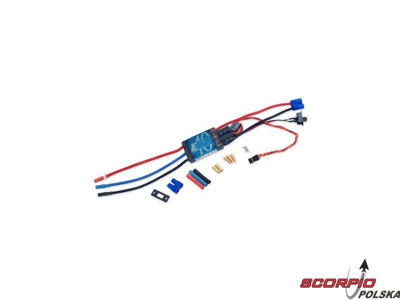 Elektroniczny regulator obrotów do silników trójfazowych modeli samolotów z modulowanym źródłem BEC 5A/5V do zasilania 3-6 ogniwami LiPol lub 9 - 18 ogniwami NiXX, opcjonalny hamulec, BEC dla 7 analogowych lub 6 cyfrowych serw standardowej wielkości.