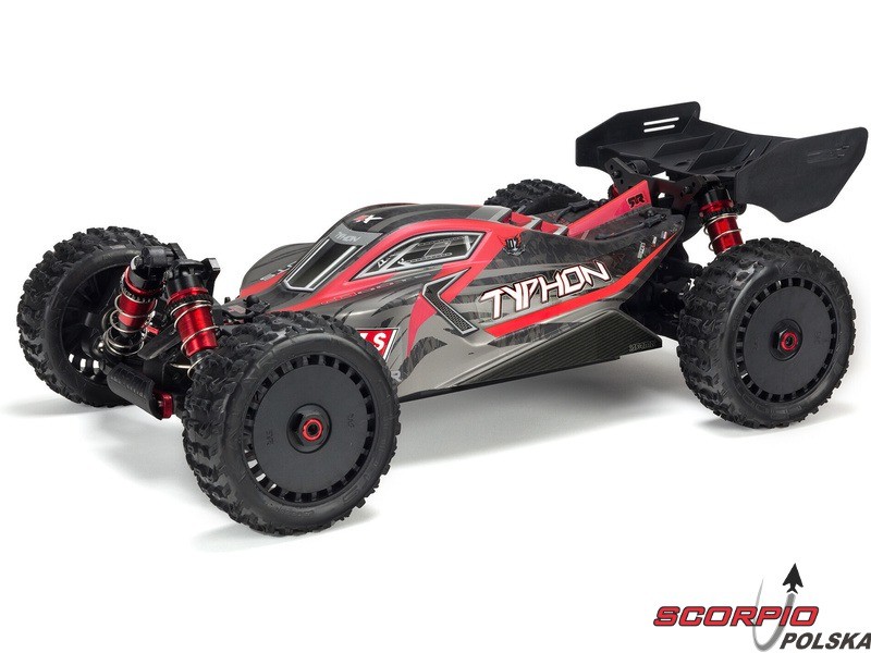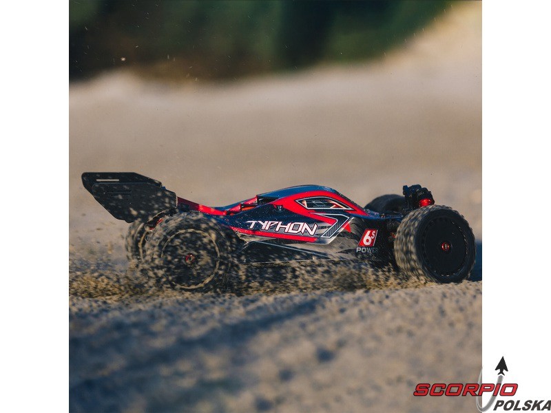 Arrma Typhon 6S BLX jest zwinnym modelem RC auta w skali 1:8 z napędem 4WD. Jest zbudowany na aluminiowym podwoziu, mocny trójfazowy silnik pozwoli mu na osiągnięcie prędkości ponad 110km/h. Model auta RC jest kompletnie złożony, do uruchomienia potrzebne są 4 baterie AA do nadajnika oraz akumulator napędowy do modelu z odpowiednią ładowarką.