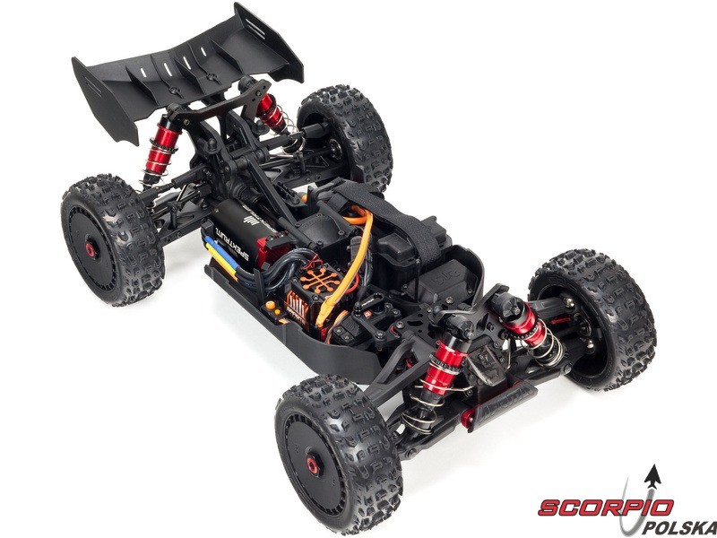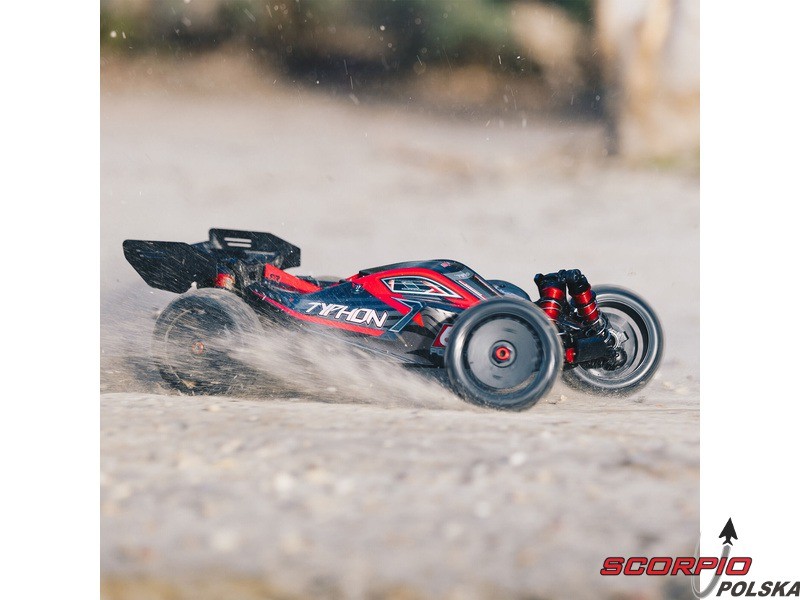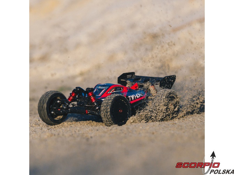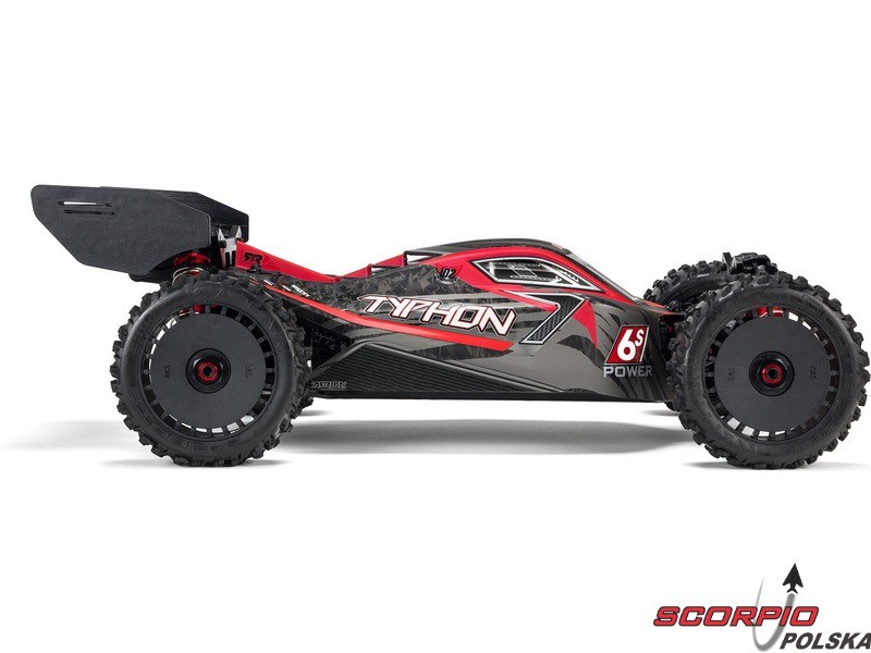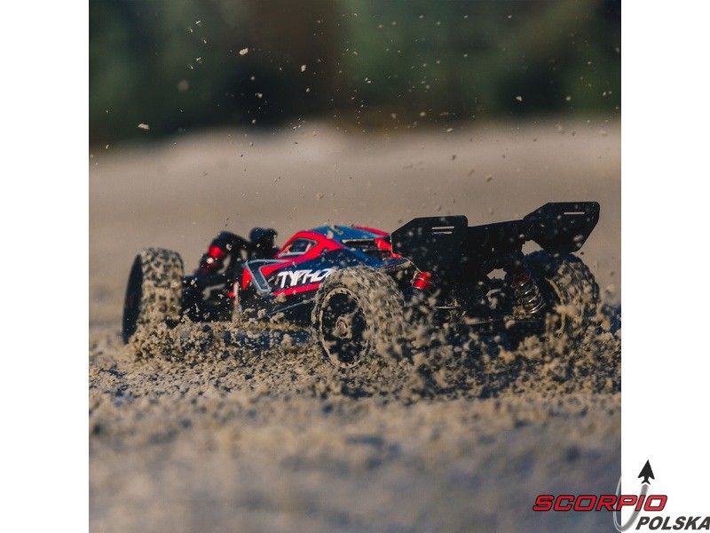 Mocne 4WD Buggy TYPHON 6S BLX do szalonej jazdy na torze off-road. Bardzo szczegółowa pomalowana karoseria ma zwiększoną ochronę na uszkodzenia. O bezpieczne przeniesienie mocy starają się stalowe wały napędowe, trwałe kompozytowe wahacze i zwrotnice, sztywne aluminiowe podwozie o grubości 3mm, 3 metalowe dyferencjały i przekładnia ze stalowymi kołami zębatymi. Jazda bez kompromisów, o brutalną moc troszczy się trójfazowy silnik Spektrum™ Firma™ 4074 2050Kv oraz regulator Spektrum™ Firma™ 150A.