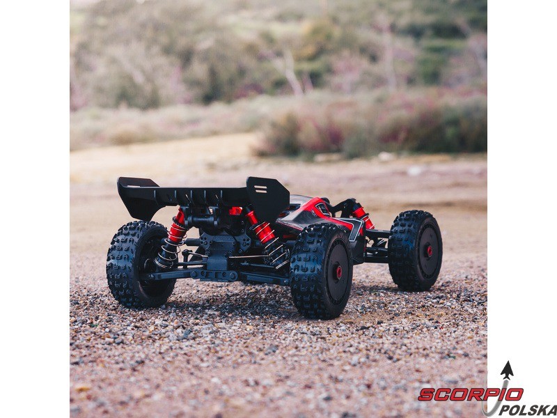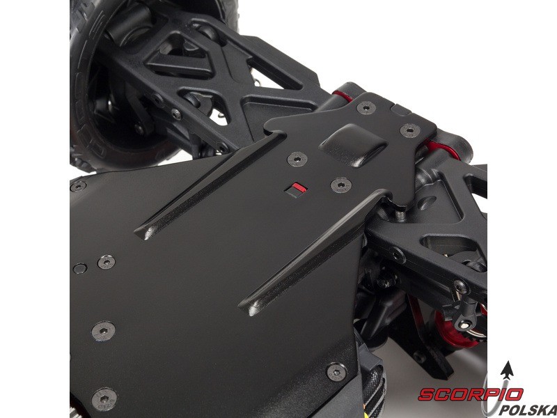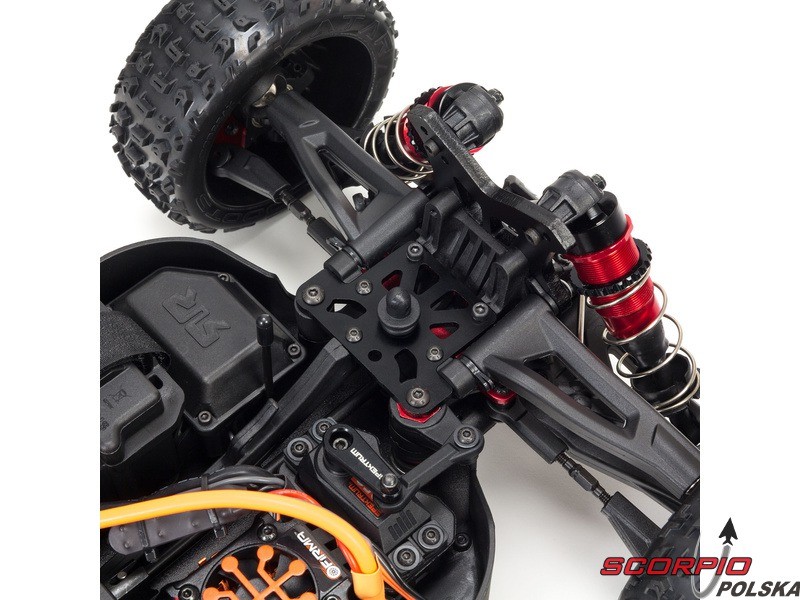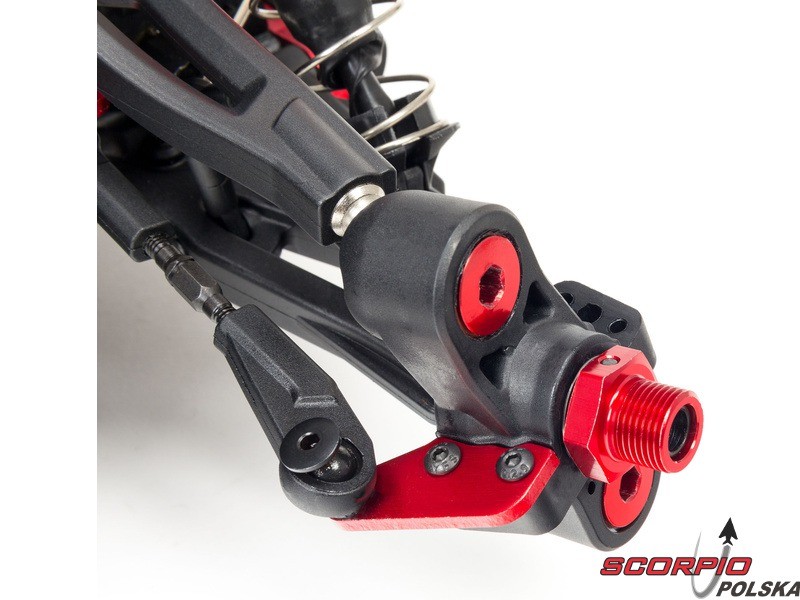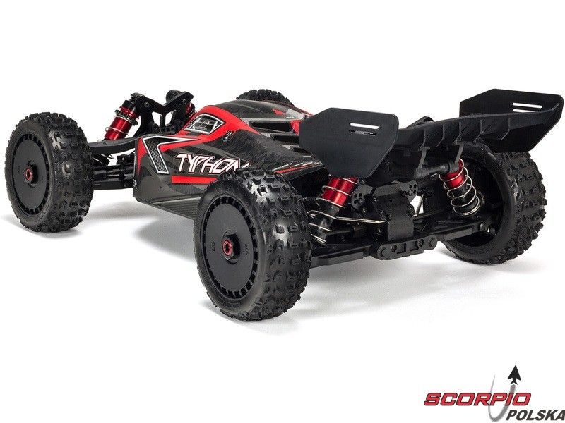 Olejowe, aluminiowe, anodowane na czerwono amortyzatory mają osłony ochronne przed uszkodzeniami przy przewróceniu wozu. TYPHON 6S BLX ma wysokiej jakości trwałe amortyzatory z możliwością ustawienia naprężenia wstępnego sprężyn. Amortyzatory są wyposażone w osłony pyłowe chroniące przed wnikaniem nieczystości do tłoka.