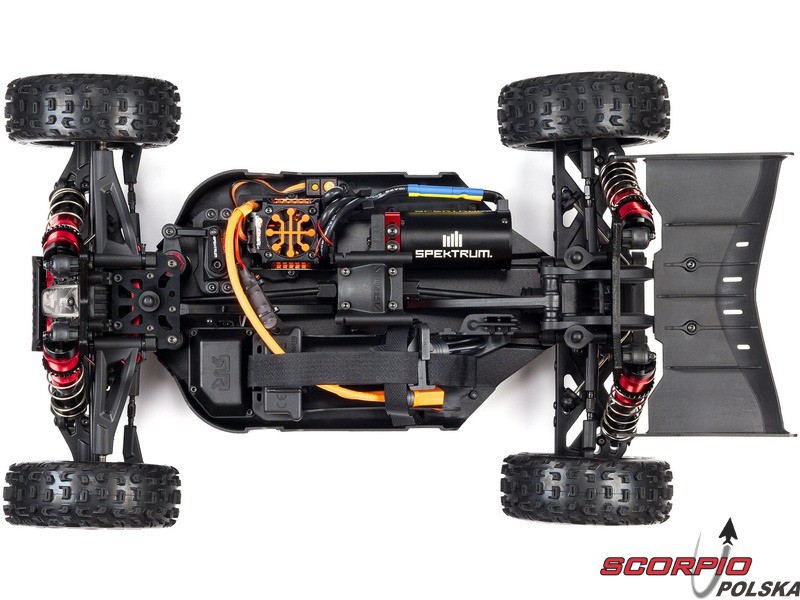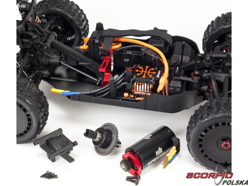 Model RC auta w skali 1:8, Arrma Typhon 6S BLX V5 z napędem 4WD jest kompletnie wyposażony komponentami Spektrum. Silnik Firma 4074 2050Kv, regulator Firma™ 150A Smart. Aluminiowe podwozie! Nadajnik Spektrum SLT3, odbiornik Spektrum™ SR315, cyfrowe serwo Spektrum™ S652.
